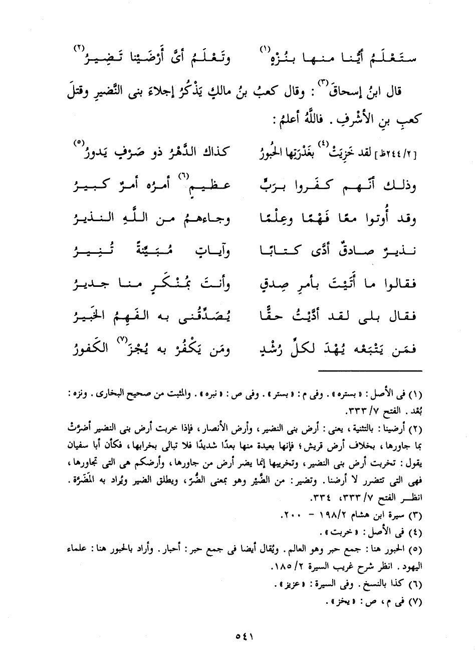 قَالَ ابْنُ إِسْحَاقَ: وَقَالَ كَعْبُ بْنُ مَالِكٍ يَذْكُرُ إِجْلَاءَ بَنِي النَّضِيرِ وَقَتْلَ كَعْبِ بْنِ الْأَشْرَفِ. فَاللَّهُ أَعْلَمُ: