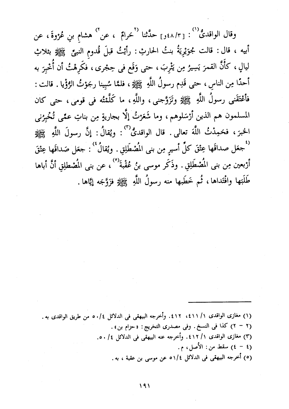 وَقَالَ الْوَاقِدِيُّ: حَدَّثَنَا حَرَامٌ، عَنْ هِشَامِ بْنِ عُرْوَةَ، عَنْ أَبِيهِ، قَالَ: قَالَتْ جُوَيْرِيَةُ بِنْتُ الْحَارِثِ: رَأَيْتُ قَبْلَ قُدُومِ النَّبِيِّ صَلَّى اللَّهُ عَلَيْهِ وَسَلَّمَ بِثَلَاثِ لَيَالٍ، كَأَنَّ الْقَمَرَ يَسِيرُ مِنْ يَثْرِبَ، حَتَّى وَقَعَ فِي حِجْرِي، فَكَرِهْتُ أَنْ أُخْبِرَ بِهِ أَحَدًا مِنَ النَّاسِ، حَتَّى قَدِمَ رَسُولُ اللَّهِ صَلَّى اللَّهُ عَلَيْهِ وَسَلَّمَ، فَلَمَّا سُبِينَا رَجَوْتُ الرُّؤْيَا. قَالَتْ: فَأَعْتَقَنِي رَسُولُ اللَّهِ صَلَّى اللَّهُ عَلَيْهِ وَسَلَّمَ وَتَزَوَّجَنِي، وَاللَّهِ، مَا كَلَّمْتُهُ فِي قَوْمِي، حَتَّى كَانَ الْمُسْلِمُونَ هُمُ الَّذِينَ أَرْسَلُوهُمْ، وَمَا شَعَرْتُ إِلَّا بِجَارِيَةٍ مِنْ بَنَاتِ عَمِّي تُخْبِرُنِي الْخَبَرَ، فَحَمِدْتُ اللَّهَ تَعَالَى. قَالَ الْوَاقِدِيُّ: وَيُقَالُ: إِنَّ رَسُولَ اللَّهِ صَلَّى اللَّهُ عَلَيْهِ وَسَلَّمَ جَعَلَ صَدَاقَهَا عِتْقَ كُلِّ أَسِيرٍ مِنْ بَنِي الْمُصْطَلِقِ. وَيُقَالُ: جَعَلَ صَدَاقَهَا عِتْقَ أَرْبَعِينَ مِنْ بَنِي الْمُصْطَلِقِ. وَذَكَرَ مُوسَى بْنُ عُقْبَةَ، عَنْ بَنِي الْمُصْطَلِقِ أَنَّ أَبَاهَا طَلَبَهَا وَافْتَدَاهَا، ثُمَّ خَطَبَهَا مِنْهُ رَسُولُ اللَّهِ صَلَّى اللَّهُ عَلَيْهِ وَسَلَّمَ فَزَوَّجَهُ إِيَّاهَا.