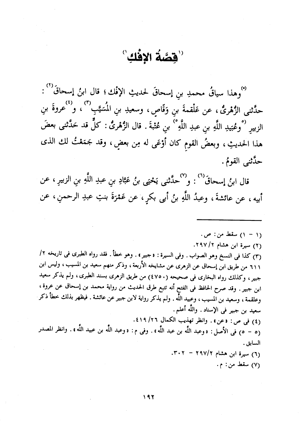 وَهَذَا سِيَاقُ مُحَمَّدِ بْنِ إِسْحَاقَ لِحَدِيثِ الْإِفْكِ؛ قَالَ ابْنُ إِسْحَاقَ: حَدَّثَنِي الزُّهْرِيُّ، عَنْ عَلْقَمَةَ بْنِ وَقَّاصٍ، وَسَعِيدِ بْنِ الْمُسَيَّبِ، وَعُرْوَةَ بْنِ الزُّبَيْرِ وَعُبَيْدِ اللَّهِ بْنِ عَبْدِ اللَّهِ بْنِ عُتْبَةَ. قَالَ الزُّهْرِيُّ: كُلٌّ قَدْ حَدَّثَنِي بَعْضَ هَذَا الْحَدِيثِ، وَبَعْضُ الْقَوْمِ كَانَ أَوْعَى لَهُ مِنْ بَعْضٍ، وَقَدْ جَمَعْتُ لَكَ كُلَّ الَّذِي حَدَّثَنِي الْقَوْمُ.