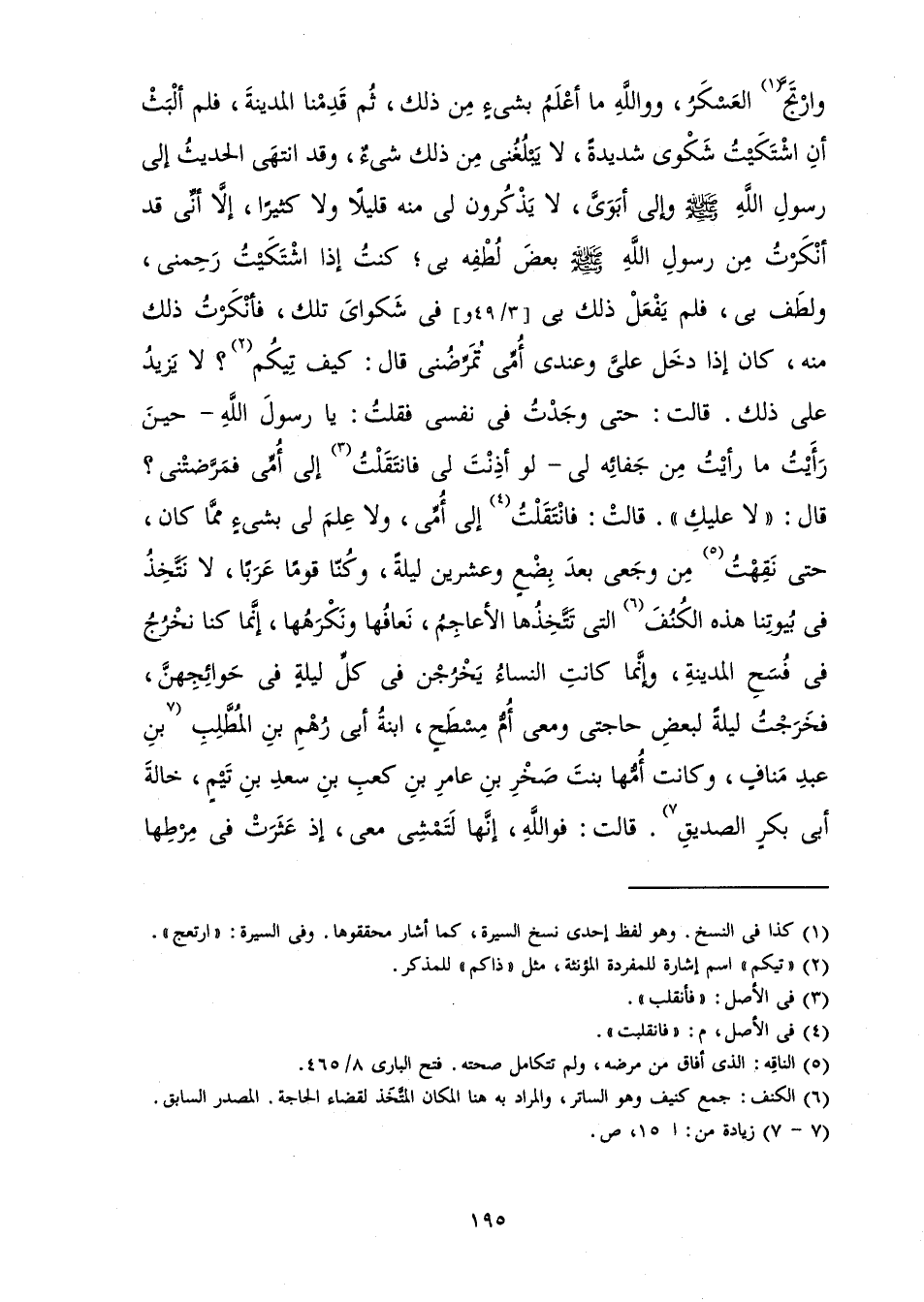 وَارْتَجَّ الْعَسْكَرُ، وَوَاللَّهِ مَا أَعْلَمُ بِشَيْءٍ مِنْ ذَلِكَ، ثُمَّ قَدِمْنَا الْمَدِينَةَ، فَلَمْ أَلْبَثْ أَنِ اشْتَكَيْتُ شَكْوَى شَدِيدَةً، لَا يَبْلُغُنِي مِنْ ذَلِكَ شَيْءٌ، وَقَدِ انْتَهَى الْحَدِيثُ إِلَى رَسُولِ اللَّهِ صَلَّى اللَّهُ عَلَيْهِ وَسَلَّمَ وَإِلَى أَبَوَيَّ، لَا يَذْكُرُونَ لِي مِنْهُ قَلِيلًا وَلَا كَثِيرًا، إِلَّا أَنِّي قَدْ أَنْكَرْتُ مِنْ رَسُولِ اللَّهِ صَلَّى اللَّهُ عَلَيْهِ وَسَلَّمَ بَعْضَ لُطْفِهِ بِي؛ كُنْتُ إِذَا اشْتَكَيْتُ رَحِمَنِي، وَلَطَفَ بِي، فَلَمْ يَفْعَلْ ذَلِكَ بِي فِي شَكْوَايَ تِلْكَ، فَأَنْكَرْتُ ذَلِكَ مِنْهُ، كَانَ إِذَا دَخَلَ عَلَيَّ وَعِنْدِي أُمِّي تُمَرِّضُنِي قَالَ: كَيْفَ تِيكُمْ؟ لَا يَزِيدُ عَلَى ذَلِكَ. قَالَتْ: حَتَّى وَجَدْتُ فِي نَفْسِي فَقُلْتُ: يَا رَسُولَ اللَّهِ - حِينَ رَأَيْتُ مَا رَأَيْتُ مِنْ جَفَائِهِ لِي - لَوْ أَذِنْتَ لِي فَانْتَقَلْتُ إِلَى أُمِّي فَمَرَّضَتْنِي؟ قَالَ: " لَا عَلَيْكِ ". قَالَتْ: فَانْتَقَلْتُ إِلَى أُمِّي، وَلَا عِلْمَ لِي بِشَيْءٍ مِمَّا كَانَ، حَتَّى نَقِهْتُ مِنْ وَجَعِي بَعْدَ بِضْعٍ وَعِشْرِينَ لَيْلَةً، وَكُنَّا قَوْمًا عَرَبًا، لَا نَتَّخِذُ فِي بُيُوتِنَا هَذِهِ الْكُنُفَ الَّتِي تَتَّخِذُهَا الْأَعَاجِمُ، نَعَافُهَا وَنَكْرَهُهَا، إِنَّمَا كُنَّا نَخْرُجُ فِي فُسَحِ الْمَدِينَةِ، وَإِنَّمَا كَانَتِ النِّسَاءُ يَخْرُجْنَ فِي كُلِّ لَيْلَةٍ فِي حَوَائِجِهِنَّ، فَخَرَجْتُ لَيْلَةً لِبَعْضِ حَاجَتِي وَمَعِيَ أُمُّ مِسْطَحٍ، ابْنَةُ أَبِي رُهْمِ بْنِ الْمُطَّلِبِ بْنِ عَبْدِ مَنَافٍ، وَكَانَتْ أُمُّهَا بِنْتَ صَخْرِ بْنِ عَامِرِ بْنِ كَعْبِ بْنِ سَعْدِ بْنِ تَيْمٍ، خَالَةَ أَبِي بَكْرٍ الصِّدِّيقِ. قَالَتْ: فَوَاللَّهِ إِنَّهَا لَتَمْشِي مَعِي، إِذْ عَثَرَتْ فِي مِرْطِهَا