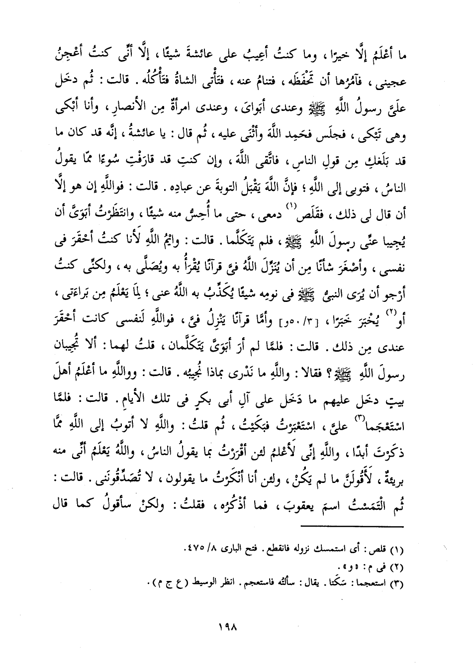 مَا أَعْلَمُ إِلَّا خَيْرًا، وَمَا كُنْتُ أَعِيبُ عَلَى عَائِشَةَ شَيْئًا، إِلَّا أَنِّي كُنْتُ أَعْجِنُ عَجِينِي، فَآمُرُهَا أَنْ تَحْفَظَهُ، فَتَنَامُ عَنْهُ، فَتَأْتِي الشَّاةُ فَتَأْكُلُهُ. قَالَتْ: ثُمَّ دَخَلَ عَلَيَّ رَسُولُ اللَّهِ صَلَّى اللَّهُ عَلَيْهِ وَسَلَّمَ وَعِنْدِي أَبَوَايَ، وَعِنْدِي امْرَأَةٌ مِنَ الْأَنْصَارِ، وَأَنَا أَبْكِي وَهِيَ تَبْكِي، فَجَلَسَ فَحَمِدَ اللَّهَ وَأَثْنَى عَلَيْهِ، ثُمَّ قَالَ: يَا عَائِشَةُ، إِنَّهُ قَدْ كَانَ مَا بَلَغَكِ مِنْ قَوْلِ النَّاسِ، فَاتَّقِي اللَّهَ، وَإِنْ كُنْتِ قَدْ قَارَفْتِ سُوءًا مِمَّا يَقُولُ النَّاسُ، فَتُوبِي إِلَى اللَّهِ؛ فَإِنَّ اللَّهَ يَقْبَلُ التَّوْبَةَ عَنْ عِبَادِهِ. قَالَتْ: فَوَاللَّهِ إِنْ هُوَ إِلَّا أَنْ قَالَ لِي ذَلِكَ، فَقَلَصَ دَمْعِي، حَتَّى مَا أُحِسُّ مِنْهُ شَيْئًا، وَانْتَظَرْتُ أَبَوَيَّ أَنْ يُجِيبَا عَنِّي رَسُولَ اللَّهِ صَلَّى اللَّهُ عَلَيْهِ وَسَلَّمَ، فَلَمْ يَتَكَلَّمَا. قَالَتْ: وَايْمُ اللَّهِ لَأَنَا كُنْتُ أَحْقَرَ فِي نَفْسِي، وَأَصْغَرَ شَأْنًا مِنْ أَنْ يُنَزِّلَ اللَّهُ فِيَّ قُرْآنًا يُقْرَأُ بِهِ وَيُصَلَّى بِهِ، وَلَكِنِّي كُنْتُ أَرْجُو أَنْ يَرَى النَّبِيُّ صَلَّى اللَّهُ عَلَيْهِ وَسَلَّمَ فِي نَوْمِهِ شَيْئًا يُكَذِّبُ بِهِ اللَّهُ عَنِّي؛ لِمَا يَعْلَمُ مِنْ بَرَاءَتِي، أَوْ يُخْبِرُ خَبَرًا، وَأَمَّا قُرْآنًا يَنْزِلُ فِيَّ، فَوَاللَّهِ لَنَفْسِي كَانَتْ أَحْقَرَ عِنْدِي مِنْ ذَلِكَ. قَالَتْ: فَلَمَّا لَمْ أَرَ أَبَوَيَّ يَتَكَلَّمَانِ، قُلْتُ لَهُمَا: أَلَا تُجِيبَانِ رَسُولَ اللَّهِ صَلَّى اللَّهُ عَلَيْهِ وَسَلَّمَ؟ فَقَالَا: وَاللَّهِ مَا نَدْرِي بِمَاذَا نُجِيبُهُ. قَالَتْ: وَوَاللَّهِ مَا أَعْلَمُ أَهْلَ بَيْتٍ دَخَلَ عَلَيْهِمْ مَا دَخَلَ عَلَى آلِ أَبِي بَكْرٍ فِي تِلْكَ الْأَيَّامِ. قَالَتْ: فَلَمَّا اسْتَعْجَمَا عَلَيَّ، اسْتَعْبَرْتُ فَبَكَيْتُ، ثُمَّ قُلْتُ: وَاللَّهِ لَا أَتُوبُ إِلَى اللَّهِ مِمَّا ذَكَرْتَ أَبَدًا، وَاللَّهِ إِنِّي لَأَعْلَمُ لَئِنْ أَقْرَرْتُ بِمَا يَقُولُ النَّاسُ، وَاللَّهُ يَعْلَمُ أَنِّي مِنْهُ بَرِيئَةٌ، لَأَقُولَنَّ مَا لَمْ يَكُنْ، وَلَئِنْ أَنَا أَنْكَرْتُ مَا يَقُولُونَ، لَا تُصَدِّقُونَنِي قَالَتْ: ثُمَّ الْتَمَسْتُ اسْمَ يَعْقُوبَ، فَمَا أَذْكُرُهُ، فَقُلْتُ: وَلَكِنْ سَأَقُولُ كَمَا قَالَ