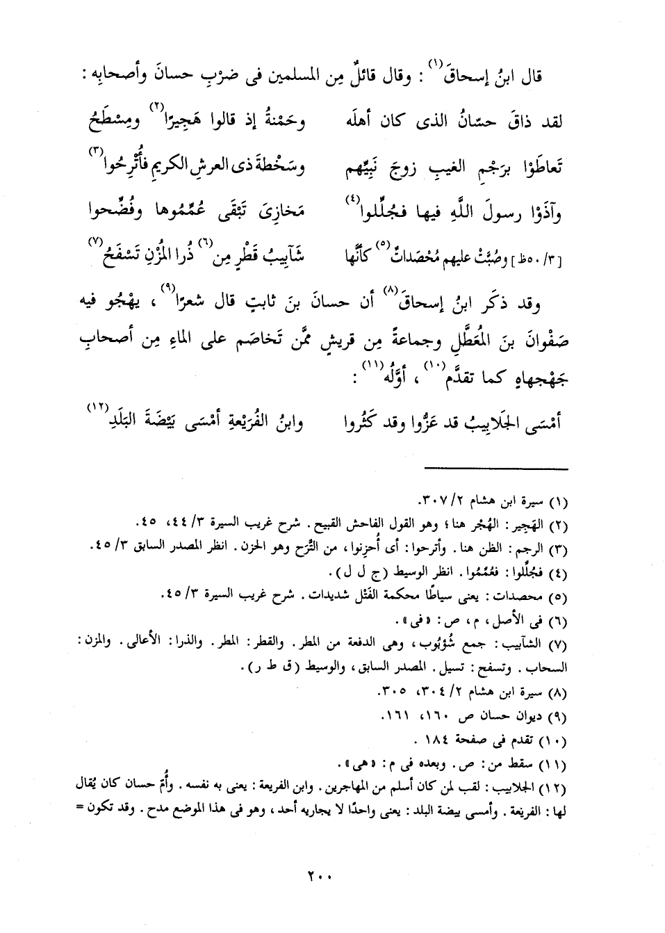 قَالَ ابْنُ إِسْحَاقَ: وَقَالَ قَائِلٌ مِنَ الْمُسْلِمِينَ فِي ضَرْبِ حَسَّانَ وَأَصْحَابِهِ: