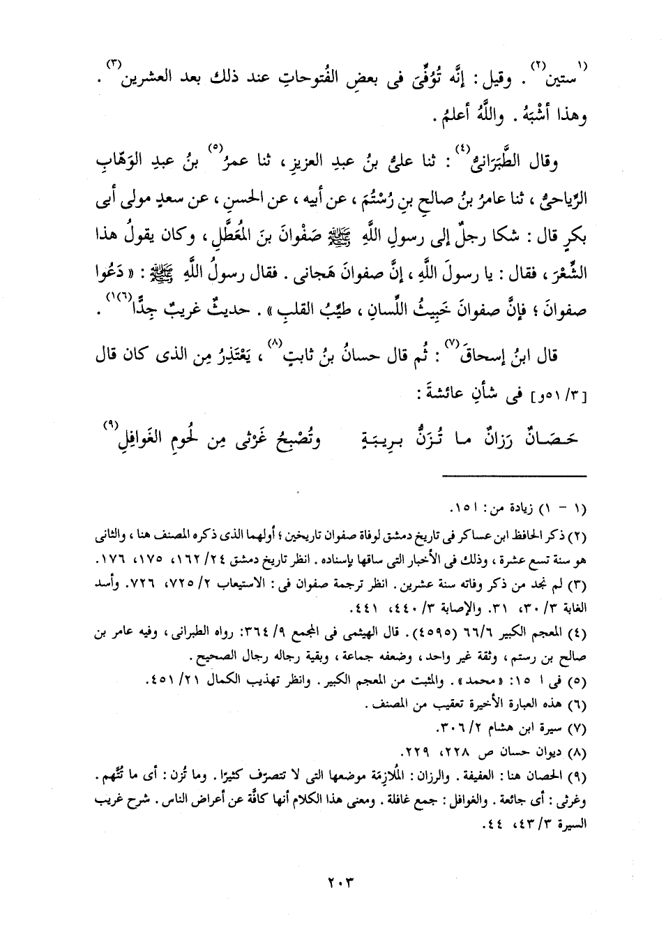 وَقَالَ الطَّبَرَانِيُّ: ثَنَا عَلِيُّ بْنُ عَبْدِ الْعَزِيزِ، ثَنَا عُمَرُ بْنُ عَبْدِ الْوَهَّابِ الرِّيَاحِيُّ، ثَنَا عَامِرُ بْنُ صَالِحِ بْنِ رُسْتُمَ، عَنْ أَبِيهِ، عَنِ الْحَسَنِ، عَنْ سَعْدٍ مَوْلَى أَبِي بَكْرٍ قَالَ: «شَكَا رَجُلٌ إِلَى رَسُولِ اللَّهِ صَلَّى اللَّهُ عَلَيْهِ وَسَلَّمَ صَفْوَانَ بْنَ الْمُعَطَّلِ، وَكَانَ يَقُولُ هَذَا الشِّعْرَ، فَقَالَ: يَا رَسُولَ اللَّهِ، إِنَّ صَفْوَانَ هَجَانِي فَقَالَ رَسُولُ اللَّهِ صَلَّى اللَّهُ عَلَيْهِ وَسَلَّمَ: " دَعُوا صَفْوَانَ؛ فَإِنَّ صَفْوَانَ خَبِيثُ اللِّسَانِ، طَيِّبُ الْقَلْبِ» حَدِيثٌ غَرِيبٌ جِدًّا.