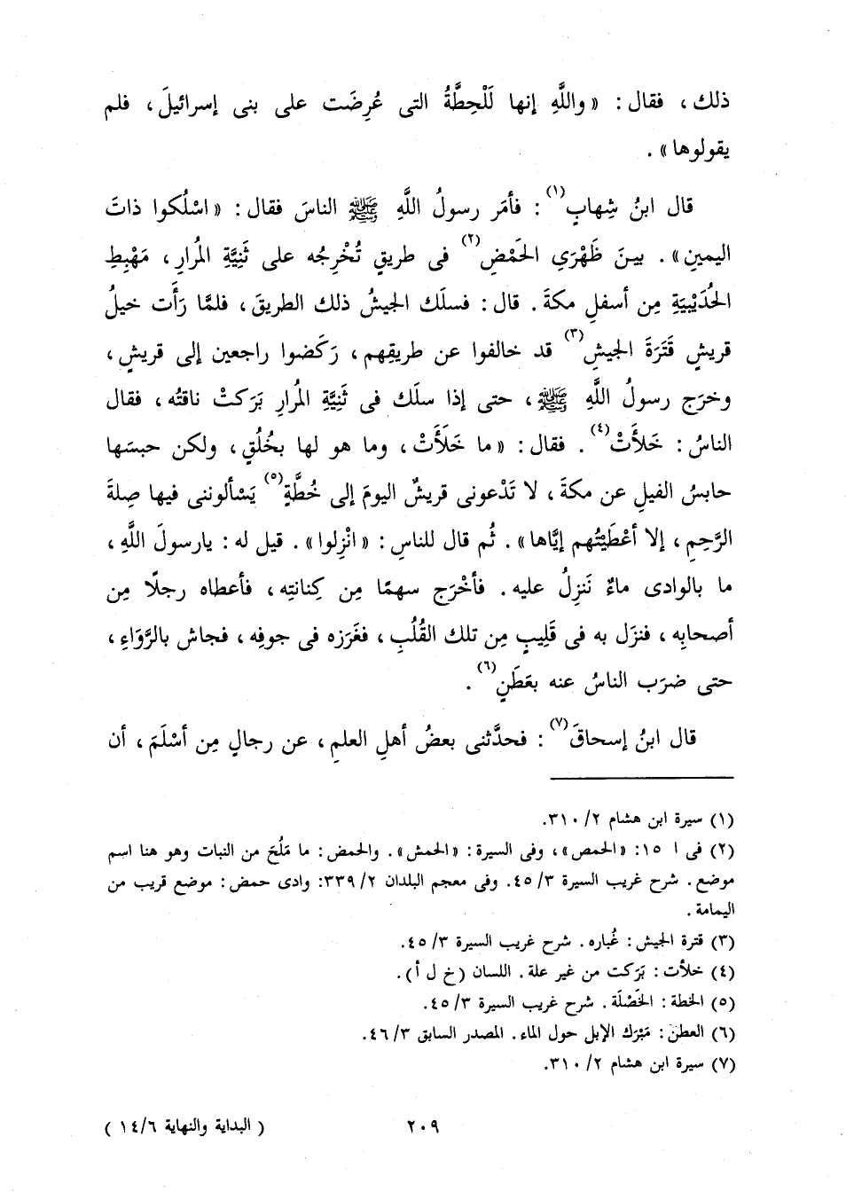 قَالَ ابْنُ شِهَابٍ: فَأَمَرَ رَسُولُ اللَّهِ صَلَّى اللَّهُ عَلَيْهِ وَسَلَّمَ النَّاسَ فَقَالَ: " «اسْلُكُوا ذَاتَ الْيَمِينِ» ". بَيْنَ ظَهْرَيِ الْحَمْضِ فِي طَرِيقٍ تُخْرِجُهُ عَلَى ثَنِيَّةِ الْمُرَارِ، مَهْبِطِ الْحُدَيْبِيَةِ مِنْ أَسْفَلِ مَكَّةَ. قَالَ: فَسَلَكَ الْجَيْشُ ذَلِكَ الطَّرِيقَ، فَلَمَّا رَأَتْ خَيْلُ قُرَيْشٍ قَتَرَةَ الْجَيْشِ قَدْ خَالَفُوا عَنْ طَرِيقِهِمْ، رَكَضُوا رَاجِعِينَ إِلَى قُرَيْشٍ، وَخَرَجَ رَسُولُ اللَّهِ صَلَّى اللَّهُ عَلَيْهِ وَسَلَّمَ، حَتَّى إِذَا سَلَكَ فِي ثَنِيَّةِ الْمُرَارِ بَرَكَتْ نَاقَتُهُ، فَقَالَ النَّاسُ: خَلَأَتْ. فَقَالَ: " «مَا خَلَأَتْ، وَمَا هُوَ لَهَا بِخُلُقٍ، وَلَكِنْ حَبَسَهَا حَابِسُ الْفِيلِ عَنْ مَكَّةَ، لَا تَدْعُونِي قُرَيْشٌ الْيَوْمَ إِلَى خُطَّةٍ يَسْأَلُونَنِي فِيهَا صِلَةَ الرَّحِمِ، إِلَّا أَعْطَيْتُهُمْ إِيَّاهَا» ". ثُمَّ قَالَ لِلنَّاسِ: " انْزِلُوا ". قِيلَ لَهُ: يَا رَسُولَ اللَّهِ، مَا بِالْوَادِي مَاءٌ نَنْزِلُ عَلَيْهِ. فَأَخْرَجَ سَهْمًا مِنْ كِنَانَتِهِ، فَأَعْطَاهُ رَجُلًا مِنْ أَصْحَابِهِ، فَنَزَلَ بِهِ فِي قَلِيبٍ مِنْ تِلْكَ الْقُلُبِ، فَغَرَزَهُ فِي جَوْفِهِ، فَجَاشَ بِالرَّوَاءِ، حَتَّى ضَرَبَ النَّاسُ عَنْهُ بِعَطَنٍ.