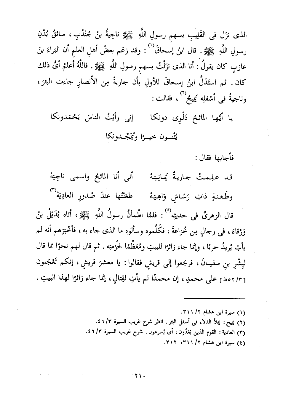 الَّذِي نَزَلَ فِي الْقَلِيبِ بِسَهْمِ رَسُولِ اللَّهِ صَلَّى اللَّهُ عَلَيْهِ وَسَلَّمَ نَاجِيَةُ بْنُ جُنْدُبٍ، سَائِقُ بُدْنِ رَسُولِ اللَّهِ صَلَّى اللَّهُ عَلَيْهِ وَسَلَّمَ. قَالَ ابْنُ إِسْحَاقَ: وَقَدْ زَعَمَ بَعْضُ أَهْلِ الْعِلْمِ أَنَّ الْبَرَاءَ بْنَ عَازِبٍ كَانَ يَقُولُ: أَنَا الَّذِي نَزَلْتُ بِسَهْمِ رَسُولِ اللَّهِ صَلَّى اللَّهُ عَلَيْهِ وَسَلَّمَ. فَاللَّهُ أَعْلَمُ أَيُّ ذَلِكَ كَانَ. ثُمَّ اسْتَدَلَّ ابْنُ إِسْحَاقَ لِلْأَوَّلِ بِأَنَّ جَارِيَةً مِنَ الْأَنْصَارِ جَاءَتِ الْبِئْرَ، وَنَاجِيَةُ فِي أَسْفَلِهِ يَمِيحُ، فَقَالَتْ: