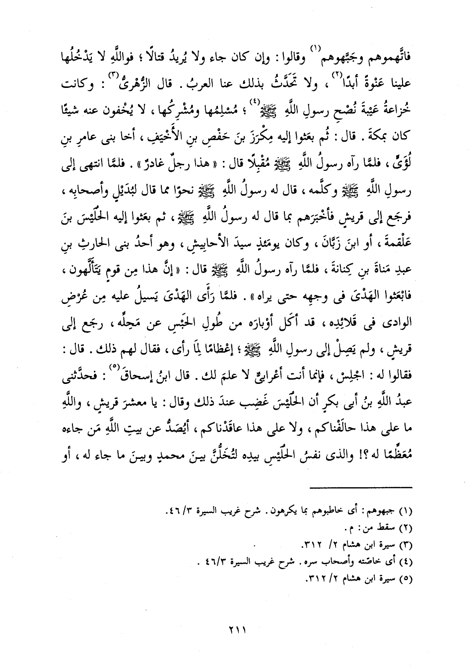 فَاتَّهَمُوهُمْ وَجَبَّهُوهُمْ وَقَالُوا: وَإِنْ كَانَ جَاءَ وَلَا يُرِيدُ قِتَالًا؛ فَوَاللَّهِ لَا يَدْخُلُهَا عَلَيْنَا عَنْوَةً أَبَدًا، وَلَا تُحَدِّثُ بِذَلِكَ عَنَّا الْعَرَبُ. قَالَ الزُّهْرِيُّ: وَكَانَتْ خُزَاعَةُ عَيْبَةَ نُصْحِ رَسُولِ اللَّهِ صَلَّى اللَّهُ عَلَيْهِ وَسَلَّمَ؛ مُسْلِمُهَا وَمُشْرِكُهَا، لَا يُخْفُونَ عَنْهُ شَيْئًا كَانَ بِمَكَّةَ. قَالَ: ثُمَّ بَعَثُوا إِلَيْهِ مِكْرَزَ بْنَ حَفْصِ بْنِ الْأَخْيَفِ، أَخَا بَنِي عَامِرِ بْنِ لُؤَيٍّ، فَلَمَّا رَآهُ رَسُولُ اللَّهِ صَلَّى اللَّهُ عَلَيْهِ وَسَلَّمَ مُقْبِلًا قَالَ: " «هَذَا رَجُلٌ غَادِرٌ» ". فَلَمَّا انْتَهَى إِلَى رَسُولِ اللَّهِ صَلَّى اللَّهُ عَلَيْهِ وَسَلَّمَ وَكَلَّمَهُ، قَالَ لَهُ رَسُولُ اللَّهِ صَلَّى اللَّهُ عَلَيْهِ وَسَلَّمَ نَحْوًا مِمَّا قَالَ لِبُدَيْلٍ وَأَصْحَابِهِ، فَرَجَعَ إِلَى قُرَيْشٍ فَأَخْبَرَهُمْ بِمَا قَالَ لَهُ رَسُولُ اللَّهِ صَلَّى اللَّهُ عَلَيْهِ وَسَلَّمَ، ثُمَّ بَعَثُوا إِلَيْهِ الْحُلَيْسَ بْنَ عَلْقَمَةَ، أَوِ ابْنَ زَبَّانَ، وَكَانَ يَوْمَئِذٍ سَيِّدَ الْأَحَابِيشِ، وَهُوَ أَحَدُ بَنِي الْحَارِثِ بْنِ عَبْدِ مَنَاةَ بْنِ كِنَانَةَ، فَلَمَّا رَآهُ رَسُولُ اللَّهِ صَلَّى اللَّهُ عَلَيْهِ وَسَلَّمَ قَالَ: " «إِنَّ هَذَا مِنْ قَوْمٍ يَتَأَلَّهُونَ، فَابْعَثُوا بِالْهَدْيِ فِي وَجْهِهِ حَتَّى يَرَاهُ» ". فَلَمَّا رَأَى الْهَدْيَ يَسِيلُ عَلَيْهِ مِنْ عُرْضِ الْوَادِي فِي قَلَائِدِهِ، قَدْ أَكَلَ أَوْبَارَهُ مِنْ طُولِ الْحَبْسِ عَنْ مَحِلِّهِ، رَجَعَ إِلَى قُرَيْشٍ، وَلَمْ يَصِلْ إِلَى رَسُولِ اللَّهِ صَلَّى اللَّهُ عَلَيْهِ وَسَلَّمَ؛ إِعْظَامًا لِمَا رَأَى، فَقَالَ لَهُمْ ذَلِكَ. قَالَ: فَقَالُوا لَهُ: اجْلِسْ، فَإِنَّمَا أَنْتَ أَعْرَابِيٌّ لَا عِلْمَ لَكَ. قَالَ ابْنُ إِسْحَاقَ: فَحَدَّثَنِي عَبْدُ اللَّهِ بْنُ أَبِي بَكْرٍ أَنَّ الْحُلَيْسَ غَضِبَ عِنْدَ ذَلِكَ وَقَالَ: يَا مَعْشَرَ قُرَيْشٍ، وَاللَّهِ مَا عَلَى هَذَا حَالَفْنَاكُمْ، وَلَا عَلَى هَذَا عَاقَدْنَاكُمْ، أَيُصَدُّ عَنْ بَيْتِ اللَّهِ مَنْ جَاءَهُ مُعَظِّمًا لَهُ؟! وَالَّذِي نَفْسُ الْحُلَيْسِ بِيَدِهِ لَتُخَلُّنَّ بَيْنَ مُحَمَّدٍ وَبَيْنَ مَا جَاءَ لَهُ، أَوْ