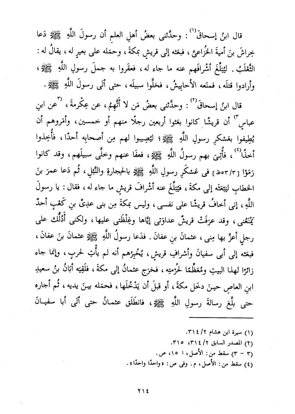 قَالَ ابْنُ إِسْحَاقَ: وَحَدَّثَنِي بَعْضُ أَهْلِ الْعِلْمِ أَنَّ رَسُولَ اللَّهِ صَلَّى اللَّهُ عَلَيْهِ وَسَلَّمَ دَعَا خِرَاشَ بْنَ أُمَيَّةَ الْخُزَاعِيَّ، فَبَعَثَهُ إِلَى قُرَيْشٍ بِمَكَّةَ، وَحَمَلَهُ عَلَى بَعِيرٍ لَهُ، يُقَالُ لَهُ: الثَّعْلَبُ. لِيُبَلِّغَ أَشْرَافَهُمْ عَنْهُ مَا جَاءَ لَهُ، فَعَقَرُوا بِهِ جَمَلَ رَسُولِ اللَّهِ صَلَّى اللَّهُ عَلَيْهِ وَسَلَّمَ، وَأَرَادُوا قَتْلَهُ، فَمَنَعَهُ الْأَحَابِيشُ، فَخَلَّوْا سَبِيلَهُ، حَتَّى أَتَى رَسُولَ اللَّهِ صَلَّى اللَّهُ عَلَيْهِ وَسَلَّمَ.