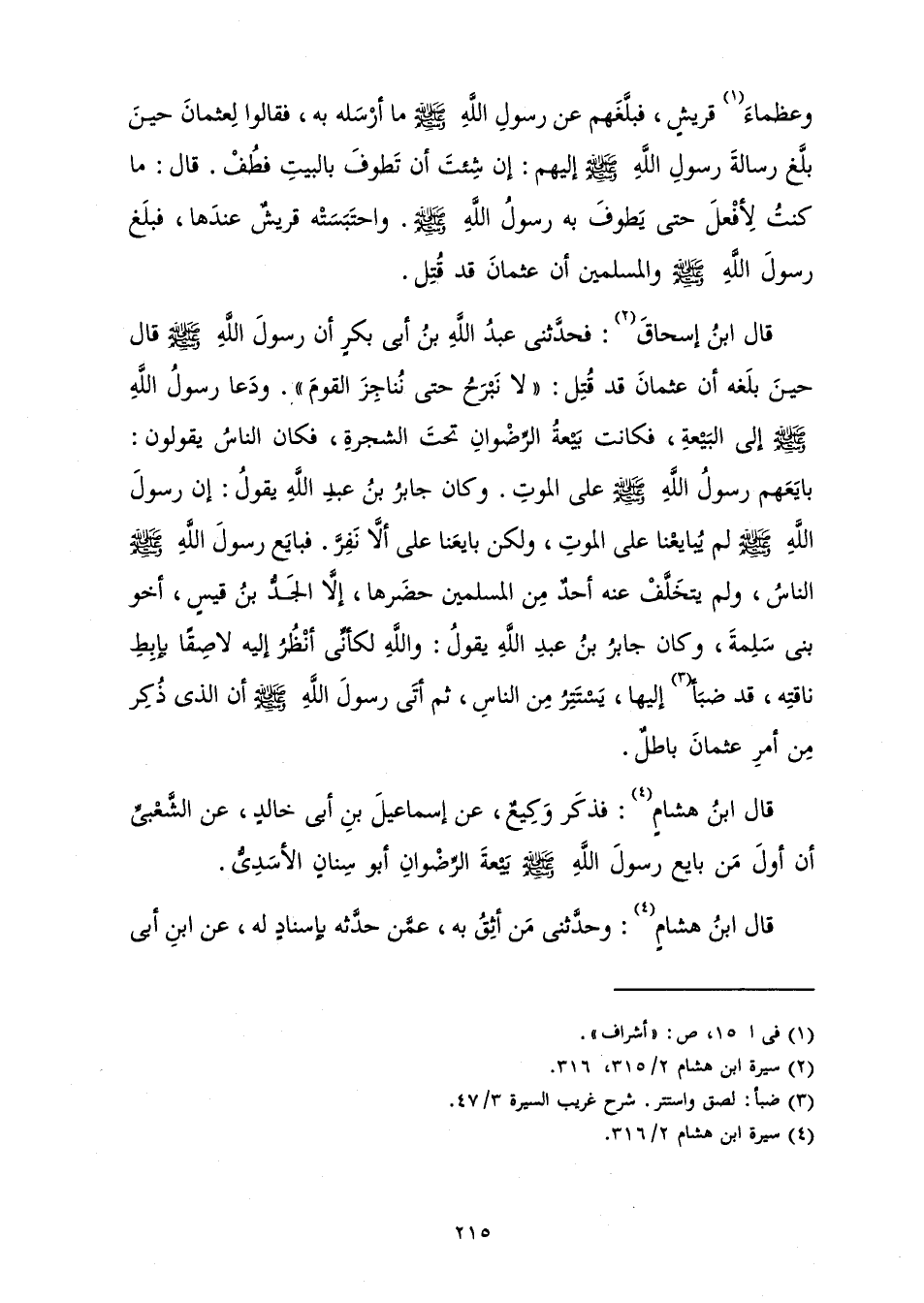 وَعُظَمَاءَ قُرَيْشٍ، فَبَلَّغَهُمْ عَنْ رَسُولِ اللَّهِ صَلَّى اللَّهُ عَلَيْهِ وَسَلَّمَ مَا أَرْسَلَهُ بِهِ، فَقَالُوا لِعُثْمَانَ حِينَ بَلَّغَ رِسَالَةَ رَسُولِ اللَّهِ صَلَّى اللَّهُ عَلَيْهِ وَسَلَّمَ إِلَيْهِمْ: إِنْ شِئْتَ أَنْ تَطُوفَ بِالْبَيْتِ فَطُفْ. قَالَ: مَا كُنْتُ لِأَفْعَلَ حَتَّى يَطُوفَ بِهِ رَسُولُ اللَّهِ صَلَّى اللَّهُ عَلَيْهِ وَسَلَّمَ. وَاحْتَبَسَتْهُ قُرَيْشٌ عِنْدَهَا، فَبَلَغَ رَسُولَ اللَّهِ صَلَّى اللَّهُ عَلَيْهِ وَسَلَّمَ وَالْمُسْلِمِينَ أَنَّ عُثْمَانَ قَدْ قُتِلَ.