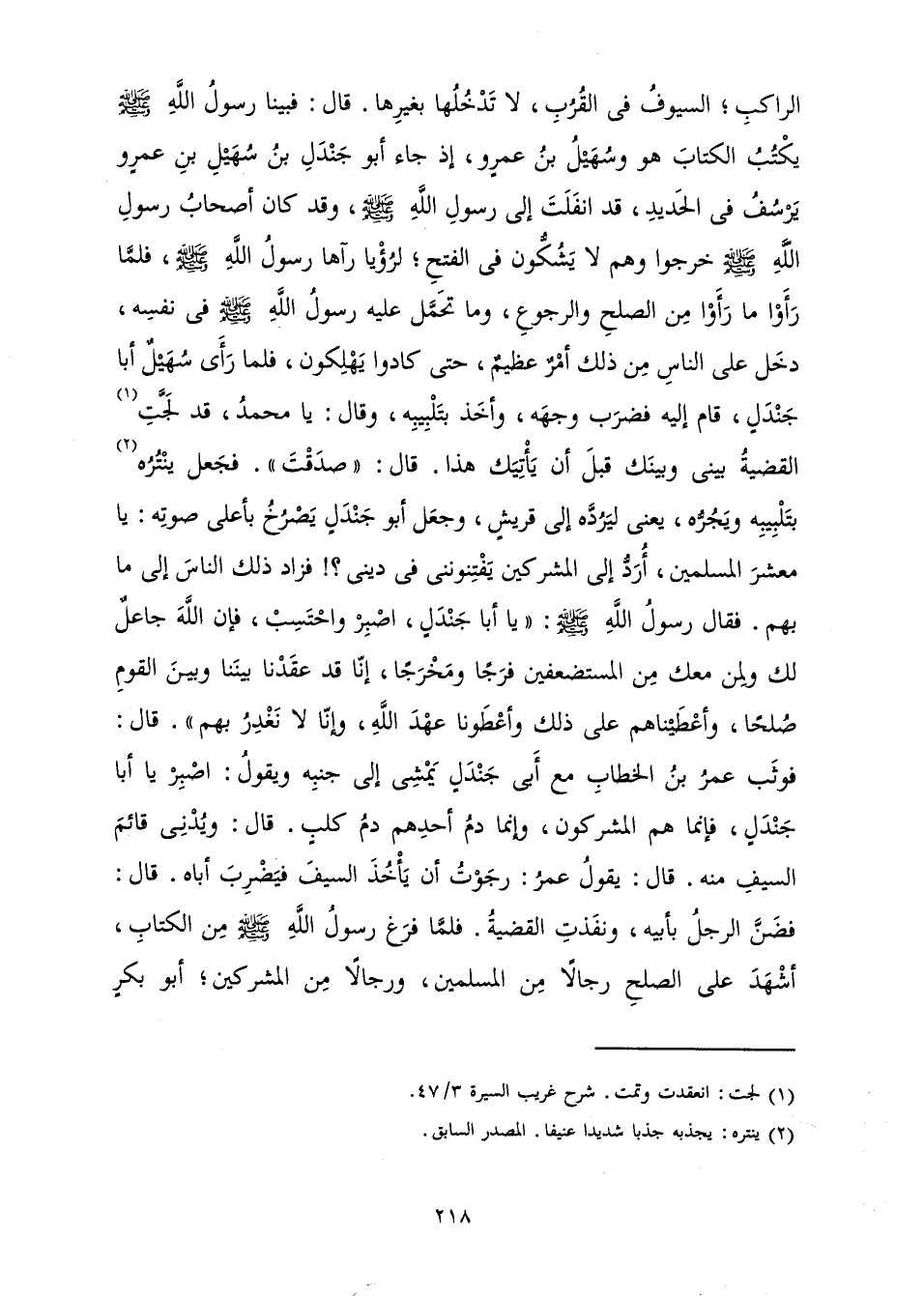 الرَّاكِبِ؛ السُّيُوفُ فِي الْقُرُبِ، لَا تَدْخُلُهَا بِغَيْرِهَا. قَالَ: فَبَيْنَا رَسُولُ اللَّهِ صَلَّى اللَّهُ عَلَيْهِ وَسَلَّمَ يَكْتُبُ الْكِتَابَ هُوَ وَسُهَيْلُ بْنُ عَمْرٍو، إِذْ جَاءَ أَبُو جَنْدَلِ بْنُ سُهَيْلِ بْنِ عَمْرٍو يَرْسُفُ فِي الْحَدِيدِ، قَدِ انْفَلَتَ إِلَى رَسُولِ اللَّهِ صَلَّى اللَّهُ عَلَيْهِ وَسَلَّمَ، وَقَدْ كَانَ أَصْحَابُ رَسُولِ اللَّهِ صَلَّى اللَّهُ عَلَيْهِ وَسَلَّمَ قَدْ خَرَجُوا وَهُمْ لَا يَشُكُّونَ فِي الْفَتْحِ؛ لِرُؤْيَا رَآهَا رَسُولُ اللَّهِ صَلَّى اللَّهُ عَلَيْهِ وَسَلَّمَ، فَلَمَّا رَأَوْا مَا رَأَوْا مِنَ الصُّلْحِ وَالرُّجُوعِ، وَمَا تَحَمَّلَ عَلَيْهِ رَسُولُ اللَّهِ صَلَّى اللَّهُ عَلَيْهِ وَسَلَّمَ فِي نَفْسِهِ، دَخَلَ عَلَى النَّاسِ مِنْ ذَلِكَ أَمْرٌ عَظِيمٌ، حَتَّى كَادُوا يَهْلِكُونَ، فَلَمَّا رَأَى سُهَيْلٌ أَبَا جَنْدَلٍ، قَامَ إِلَيْهِ فَضَرَبَ وَجْهَهُ، وَأَخَذَ بِتَلْبِيبِهِ، وَقَالَ: يَا مُحَمَّدُ، قَدْ لَجَّتِ الْقَضِيَّةُ بَيْنِي وَبَيْنَكَ قَبْلَ أَنْ يَأْتِيَكَ هَذَا. قَالَ: " صَدَقْتَ " فَجَعَلَ يَنْتُرُهُ بِتَلْبِيبِهِ وَيَجُرُّهُ، يَعْنِي لِيَرُدَّهُ إِلَى قُرَيْشٍ، وَجَعَلَ أَبُو جَنْدَلٍ يَصْرُخُ بِأَعْلَى صَوْتِهِ: يَا مَعْشَرَ الْمُسْلِمِينَ، أُرَدُّ إِلَى الْمُشْرِكِينَ يَفْتِنُونِنِي فِي دِينِي؟ ! فَزَادَ ذَلِكَ النَّاسَ إِلَى مَا بِهِمْ. فَقَالَ رَسُولُ اللَّهِ صَلَّى اللَّهُ عَلَيْهِ وَسَلَّمَ: " «يَا أَبَا جَنْدَلٍ اصْبِرْ وَاحْتَسِبْ، فَإِنَّ اللَّهَ جَاعِلٌ لَكَ وَلِمَنْ مَعَكَ مِنَ الْمُسْتَضْعَفِينَ فَرَجًا وَمَخْرَجًا، إِنَّا قَدْ عَقَدْنَا بَيْنَنَا وَبَيْنَ الْقَوْمِ صُلْحًا، وَأَعْطَيْنَاهُمْ عَلَى ذَلِكَ وَأَعْطَوْنَا عَهْدَ اللَّهِ، وَإِنَّا لَا نَغْدِرُ بِهِمْ» ". قَالَ: فَوَثَبَ عُمَرُ بْنُ الْخَطَّابِ مَعَ أَبِي جَنْدَلٍ يَمْشِي إِلَى جَنْبِهِ وَيَقُولُ: اصْبِرْ يَا أَبَا جَنْدَلٍ، فَإِنَّمَا هُمُ الْمُشْرِكُونَ، وَإِنَّمَا دَمُ أَحَدِهِمْ دَمُ كَلْبٍ. قَالَ: وَيُدْنِي قَائِمَ السَّيْفِ مِنْهُ. قَالَ: يَقُولُ عُمَرُ: رَجَوْتُ أَنْ يَأْخُذَ السَّيْفَ فَيَضْرِبَ أَبَاهُ. قَالَ: فَضَنَّ الرَّجُلُ بِأَبِيهِ، وَنَفَذَتِ الْقَضِيَّةُ. فَلَمَّا فَرَغَ رَسُولُ اللَّهِ صَلَّى اللَّهُ عَلَيْهِ وَسَلَّمَ مِنَ الْكِتَابِ، أَشْهَدَ عَلَى الصُّلْحِ رِجَالًا مِنَ الْمُسْلِمِينَ، وَرِجَالًا مِنَ الْمُشْرِكِينَ؛ أَبُو بَكْرٍ الصِّدِّيقُ،