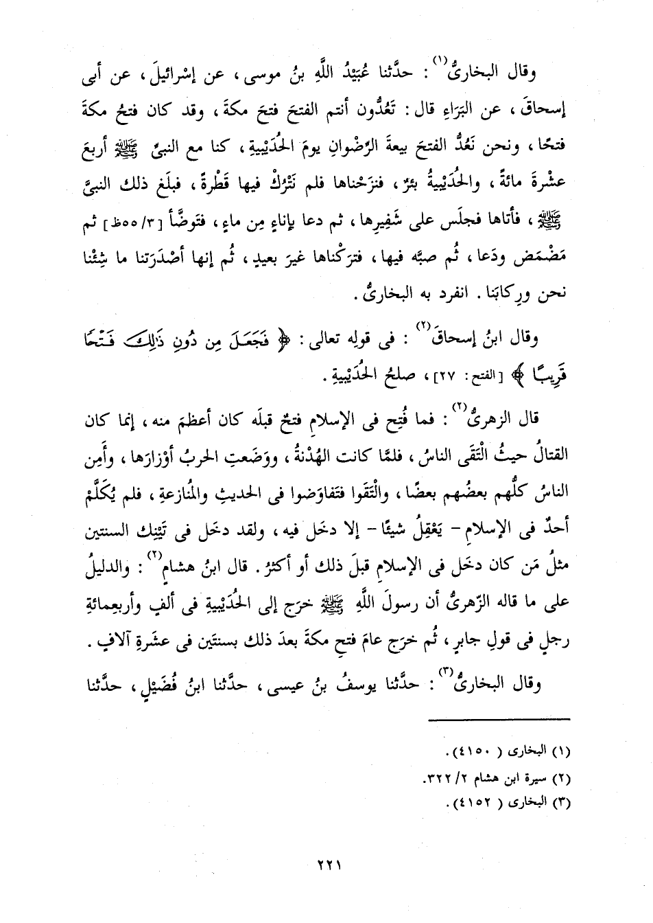 وَقَالَ الْبُخَارِيُّ: حَدَّثَنَا عُبَيْدُ اللَّهِ بْنُ مُوسَى، عَنْ إِسْرَائِيلَ، عَنْ أَبِي إِسْحَاقَ، عَنِ الْبَرَاءِ قَالَ: «تَعُدُّونَ أَنْتُمُ الْفَتْحَ فَتْحَ مَكَّةَ وَقَدْ كَانَ فَتْحُ مَكَّةَ فَتْحًا، وَنَحْنُ نَعُدُّ الْفَتْحَ بَيْعَةَ الرِّضْوَانِ يَوْمَ الْحُدَيْبِيَةِ، كُنَّا مَعَ النَّبِيِّ صَلَّى اللَّهُ عَلَيْهِ وَسَلَّمَ أَرْبَعَ عَشْرَةَ مِائَةً، وَالْحُدَيْبِيَةُ بِئْرٌ، فَنَزَحْنَاهَا فَلَمْ نَتْرُكْ فِيهَا قَطْرَةً، فَبَلَغَ ذَلِكَ النَّبِيَّ صَلَّى اللَّهُ عَلَيْهِ وَسَلَّمَ فَأَتَاهَا فَجَلَسَ عَلَى شَفِيرِهَا، ثُمَّ دَعَا بِإِنَاءٍ مِنْ مَاءٍ، فَتَوَضَّأَ ثُمَّ مَضْمَضَ وَدَعَا، ثُمَّ صَبَّهُ فِيهَا، فَتَرَكْنَاهَا غَيْرَ بَعِيدٍ، ثُمَّ إِنَّهَا أَصْدَرَتْنَا مَا شِئْنَا نَحْنُ وَرِكَابَنَا» . انْفَرَدَ بِهِ الْبُخَارِيُّ.