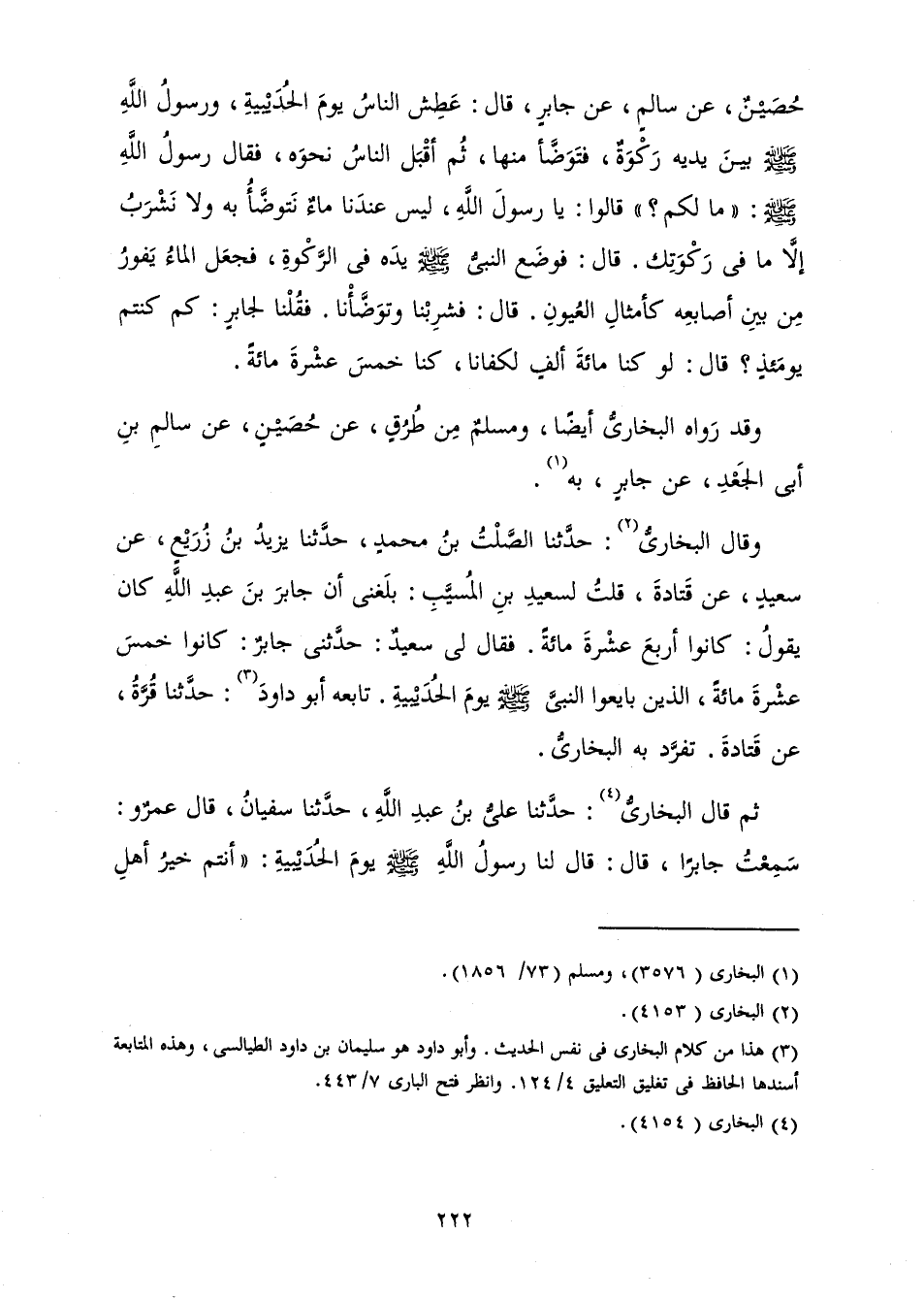 وَقَالَ الْبُخَارِيُّ: حَدَّثَنَا الصَّلْتُ بْنُ مُحَمَّدٍ، حَدَّثَنَا يَزِيدُ بْنُ زُرَيْعٍ، عَنْ سَعِيدٍ، عَنْ قَتَادَةَ، قُلْتُ لِسَعِيدِ بْنِ الْمُسَيَّبِ: بَلَغَنِي أَنَّ جَابِرَ بْنَ عَبْدِ اللَّهِ كَانَ يَقُولُ: كَانُوا أَرْبَعَ عَشْرَةَ مِائَةً. فَقَالَ لِي سَعِيدٌ: حَدَّثَنِي جَابِرٌ: كَانُوا خَمْسَ عَشْرَةَ مِائَةً، الَّذِينَ بَايَعُوا النَّبِيَّ صَلَّى اللَّهُ عَلَيْهِ وَسَلَّمَ يَوْمَ الْحُدَيْبِيَةِ. تَابَعَهُ أَبُو دَاوُدَ: حَدَّثَنَا قُرَّةُ، عَنْ قَتَادَةَ. تَفَرَّدَ بِهِ الْبُخَارِيُّ.