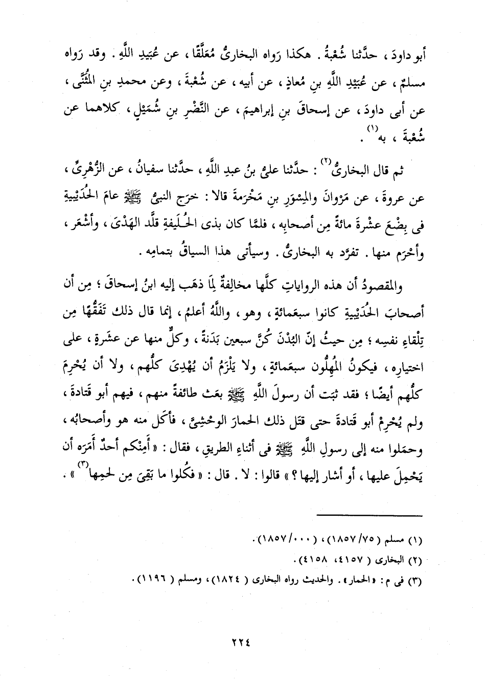 ثُمَّ قَالَ الْبُخَارِيُّ: حَدَّثَنَا عَلِيُّ بْنُ عَبْدِ اللَّهِ، حَدَّثَنَا سُفْيَانُ، عَنِ الزُّهْرِيِّ، عَنْ عُرْوَةَ، عَنْ مَرْوَانَ وَالْمِسْوَرِ بْنِ مَخْرَمَةَ قَالَا: «خَرَجَ النَّبِيُّ صَلَّى اللَّهُ عَلَيْهِ وَسَلَّمَ عَامَ الْحُدَيْبِيَةِ فِي بِضْعَ عَشْرَةَ مِائَةً مِنْ أَصْحَابِهِ، فَلَمَّا كَانَ بِذِي الْحُلَيْفَةِ قَلَّدَ الْهَدْيَ، وَأَشْعَرَ، وَأَحْرَمَ مِنْهَا» . تَفَرَّدَ بِهِ الْبُخَارِيُّ. وَسَيَأْتِي هَذَا السِّيَاقُ بِتَمَامِهِ.