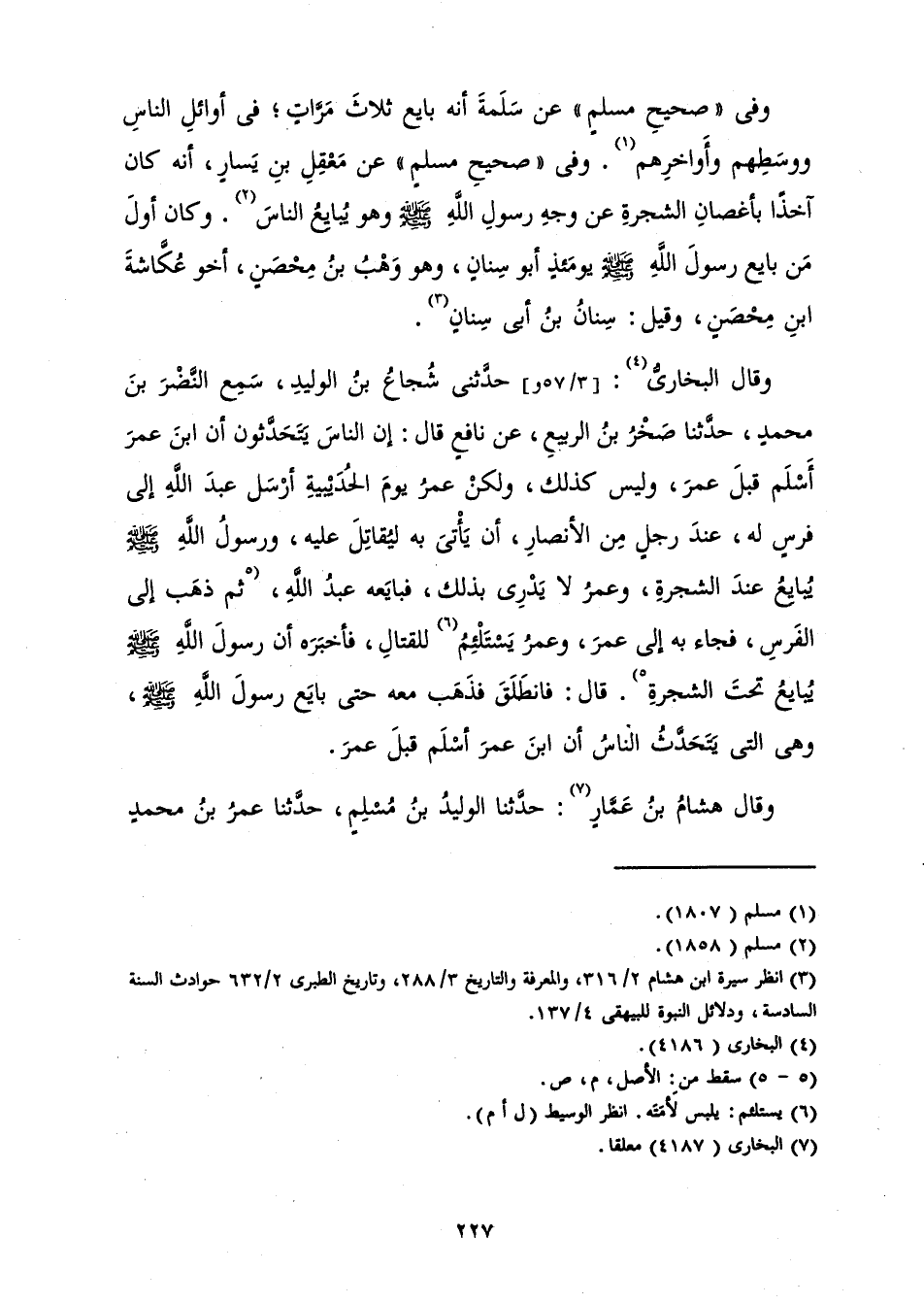 وَفِي " صَحِيحِ مُسْلِمٍ " عَنْ سَلَمَةَ أَنَّهُ بَايَعَ ثَلَاثَ مَرَّاتٍ؛ فِي أَوَائِلِ النَّاسِ وَوَسَطِهِمْ وَأَوَاخِرِهِمْ. وَفِي " صَحِيحِ مُسْلِمٍ " عَنْ مَعْقِلِ بْنِ يَسَارٍ أَنَّهُ كَانَ آخِذًا بِأَغْصَانِ الشَّجَرَةِ عَنْ وَجْهِ رَسُولِ اللَّهِ صَلَّى اللَّهُ عَلَيْهِ وَسَلَّمَ وَهُوَ يُبَايِعُ النَّاسَ. وَكَانَ أَوَّلَ مَنْ بَايَعَ رَسُولَ اللَّهِ صَلَّى اللَّهُ عَلَيْهِ وَسَلَّمَ يَوْمَئِذٍ أَبُو سِنَانٍ، وَهُوَ وَهْبُ بْنُ مِحْصَنٍ، أَخُو عُكَّاشَةَ بْنِ مِحْصَنٍ، وَقِيلَ: سِنَانُ بْنُ أَبِي سِنَانٍ.