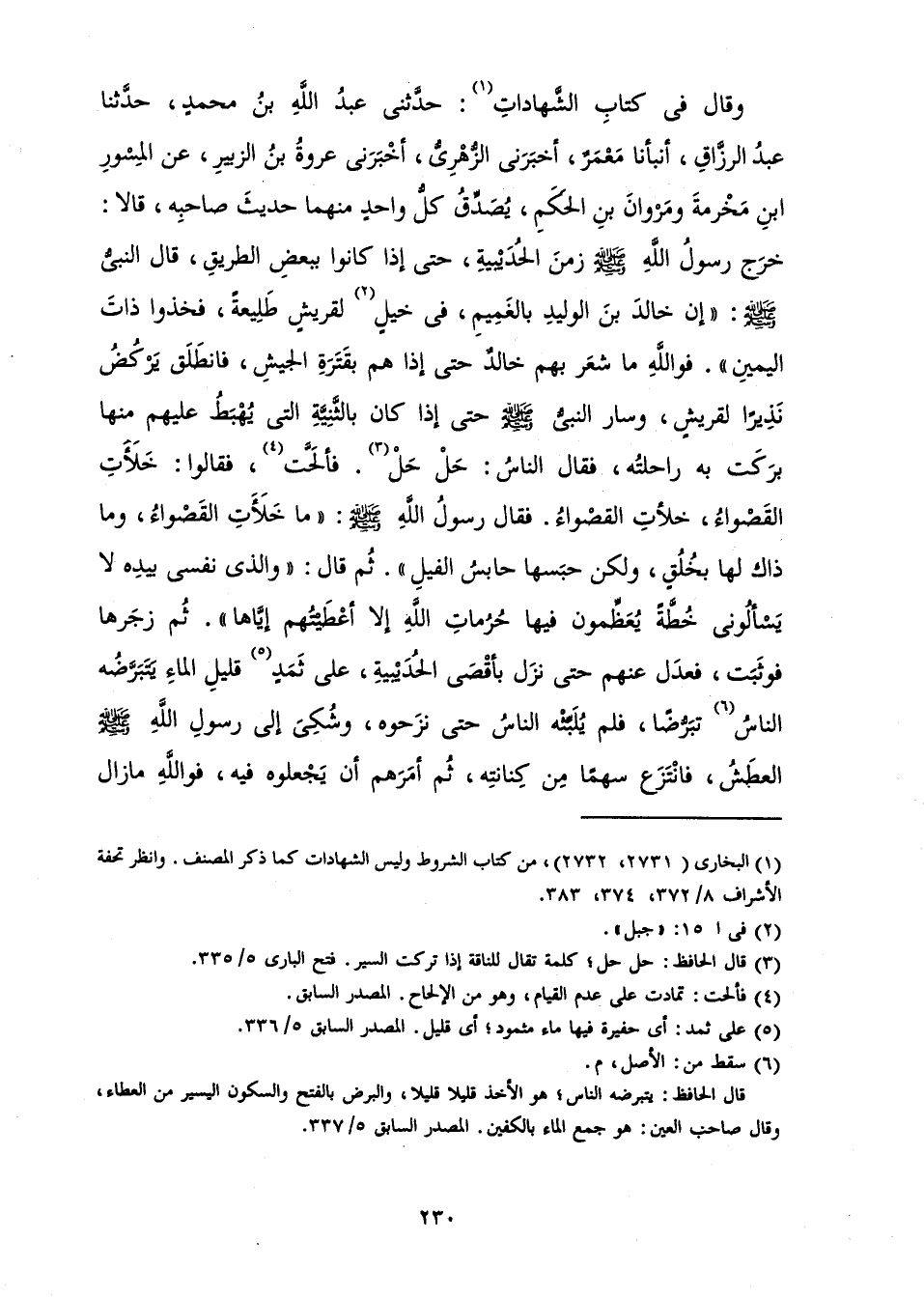 وَقَالَ فِي كِتَابِ الشَّهَادَاتِ: حَدَّثَنِي عَبْدُ اللَّهِ بْنُ مُحَمَّدٍ، حَدَّثَنَا عَبْدُ الرَّزَّاقِ، أَنْبَأَنَا مَعْمَرٌ، أَخْبَرَنِي الزُّهْرِيُّ، أَخْبَرَنِي عُرْوَةُ بْنُ الزُّبَيْرِ،، عَنِ الْمِسْوَرِ بْنِ مَخْرَمَةَ وَمَرْوَانَ بْنِ الْحَكَمِ، يُصَدِّقُ كُلُّ وَاحِدٍ مِنْهُمَا حَدِيثَ صَاحِبِهِ، قَالَا: «خَرَجَ رَسُولُ اللَّهِ صَلَّى اللَّهُ عَلَيْهِ وَسَلَّمَ زَمَنَ الْحُدَيْبِيَةِ، حَتَّى إِذَا كَانُوا بِبَعْضِ الطَّرِيقِ، قَالَ النَّبِيُّ صَلَّى اللَّهُ عَلَيْهِ وَسَلَّمَ: " إِنَّ خَالِدَ بْنَ الْوَلِيدِ بِالْغَمِيمِ، فِي خَيْلٍ لِقُرَيْشٍ طَلِيعَةً، فَخُذُوا ذَاتَ الْيَمِينِ ". فَوَاللَّهِ مَا شَعَرَ بِهِمْ خَالِدٌ حَتَّى إِذَا هُمْ بِقَتَرَةِ الْجَيْشِ، فَانْطَلَقَ يَرْكُضُ نَذِيرًا لِقُرَيْشٍ، وَسَارَ النَّبِيُّ صَلَّى اللَّهُ عَلَيْهِ وَسَلَّمَ حَتَّى إِذَا كَانَ بِالثَّنِيَّةِ الَّتِي يُهْبَطُ عَلَيْهِمْ مِنْهَا بَرَكَتْ بِهِ رَاحِلَتُهُ، فَقَالَ النَّاسُ: حَلْ حَلْ. فَأَلَحَّتْ، فَقَالُوا: خَلَأَتِ الْقَصْوَاءُ، خَلَأَتِ الْقَصْوَاءُ. فَقَالَ رَسُولُ اللَّهِ صَلَّى اللَّهُ عَلَيْهِ وَسَلَّمَ: " مَا خَلَأَتِ الْقَصْوَاءُ، وَمَا ذَاكَ لَهَا بِخُلُقٍ، وَلَكِنْ حَبَسَهَا حَابِسُ الْفِيلِ ". ثُمَّ قَالَ: " وَالَّذِي نَفْسِي بِيَدِهِ لَا يَسْأَلُونِي خُطَّةً يُعَظِّمُونَ فِيهَا حُرُمَاتِ اللَّهِ إِلَّا أَعْطَيْتُهُمْ إِيَّاهَا ". ثُمَّ زَجَرَهَا فَوَثَبَتْ، فَعَدَلَ عَنْهُمْ حَتَّى نَزَلَ بِأَقْصَى الْحُدَيْبِيَةِ، عَلَى ثَمَدٍ قَلِيلِ الْمَاءِ يَتَبَرَّضُهُ النَّاسُ تَبَرُّضًا، فَلَمْ يُلَبِّثْهُ النَّاسُ حَتَّى نَزَحُوهُ، وَشُكِيَ إِلَى رَسُولِ اللَّهِ صَلَّى اللَّهُ عَلَيْهِ وَسَلَّمَ الْعَطَشَ، فَانْتَزَعَ سَهْمًا مِنْ كِنَانَتِهِ، ثُمَّ أَمَرَهُمْ أَنْ يَجْعَلُوهُ فِيهِ، فَوَاللَّهِ مَازَالَ
