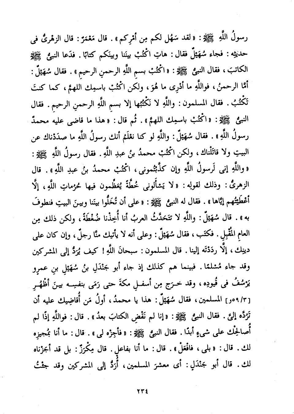 رَسُولُ اللَّهِ صَلَّى اللَّهُ عَلَيْهِ وَسَلَّمَ: " لَقَدْ سَهُلَ لَكُمْ مِنْ أَمْرِكُمْ» قَالَ مَعْمَرٌ: قَالَ الزُّهْرِيُّ فِي حَدِيثِهِ: فَجَاءَ سُهَيْلٌ فَقَالَ: هَاتِ اكْتُبْ بَيْنَنَا وَبَيْنَكُمْ كِتَابًا. فَدَعَا النَّبِيُّ صَلَّى اللَّهُ عَلَيْهِ وَسَلَّمَ الْكَاتِبَ، فَقَالَ النَّبِيُّ صَلَّى اللَّهُ عَلَيْهِ وَسَلَّمَ: " اكْتُبْ بِسْمِ اللَّهِ الرَّحْمَنِ الرَّحِيمِ ". فَقَالَ سُهَيْلٌ: أَمَّا الرَّحْمَنُ، فَوَاللَّهِ مَا أَدْرِي مَا هُوَ، وَلَكِنِ اكْتُبْ بِاسْمِكَ اللَّهُمَّ، كَمَا كُنْتَ تَكْتُبُ. فَقَالَ الْمُسْلِمُونَ: وَاللَّهِ لَا نَكْتُبُهَا إِلَّا بِسْمِ اللَّهِ الرَّحْمَنِ الرَّحِيمِ. فَقَالَ النَّبِيُّ صَلَّى اللَّهُ عَلَيْهِ وَسَلَّمَ: " اكْتُبْ بِاسْمِكَ اللَّهُمَّ ". ثُمَّ قَالَ: " هَذَا مَا قَاضَى عَلَيْهِ مُحَمَّدٌ رَسُولُ اللَّهِ ". فَقَالَ سُهَيْلٌ: وَاللَّهِ لَوْ كُنَّا نَعْلَمُ أَنَّكَ رَسُولُ اللَّهِ مَا صَدَدْنَاكَ عَنِ الْبَيْتِ وَلَا قَاتَلْنَاكَ، وَلَكِنِ اكْتُبْ مُحَمَّدُ بْنُ عَبْدِ اللَّهِ. فَقَالَ رَسُولُ اللَّهِ صَلَّى اللَّهُ عَلَيْهِ وَسَلَّمَ: " وَاللَّهِ إِنِّي لَرَسُولُ اللَّهِ وَإِنْ كَذَّبْتُمُونِي، اكْتُبْ مُحَمَّدُ بْنُ عَبْدِ اللَّهِ ". قَالَ الزُّهْرِيُّ: وَذَلِكَ لِقَوْلِهِ: " لَا يَسْأَلُونِي خُطَّةً يُعَظِّمُونَ فِيهَا حُرُمَاتِ اللَّهِ، إِلَّا أَعْطَيْتُهُمْ إِيَّاهَا ". فَقَالَ لَهُ النَّبِيُّ صَلَّى اللَّهُ عَلَيْهِ وَسَلَّمَ: " عَلَى أَنْ تُخَلُّوا بَيْنَنَا وَبَيْنَ الْبَيْتِ فَنَطُوفُ بِهِ ". قَالَ سُهَيْلٌ: وَاللَّهِ لَا تَتَحَدَّثُ الْعَرَبُ أَنَّا أُخِذْنَا ضُغْطَةً، وَلَكِنْ ذَلِكَ مِنَ الْعَامِ الْمُقْبِلِ، فَكَتَبَ، فَقَالَ سُهَيْلٌ: وَعَلَى أَنَّهُ لَا يَأْتِيكَ مِنَّا رَجُلٌ، وَإِنْ كَانَ عَلَى دِينِكَ، إِلَّا رَدَدْتَهُ إِلَيْنَا. قَالَ الْمُسْلِمُونَ: سُبْحَانَ اللَّهِ! كَيْفَ يُرَدُّ إِلَى الْمُشْرِكِينَ وَقَدْ جَاءَ مُسْلِمًا. فَبَيْنَمَا هُمْ كَذَلِكَ إِذْ جَاءَ أَبُو جَنْدَلِ بْنُ سُهَيْلِ بْنِ عَمْرٍو يَرْسُفُ فِي قُيُودِهِ، وَقَدْ خَرَجَ مِنْ أَسْفَلِ مَكَّةَ حَتَّى رَمَى بِنَفْسِهِ بَيْنَ أَظْهُرِ الْمُسْلِمِينَ، فَقَالَ سُهَيْلٌ: هَذَا يَا مُحَمَّدُ، أَوَّلُ مَنْ أُقَاضِيكَ عَلَيْهِ أَنْ تَرُدَّهُ إِلَيَّ. فَقَالَ النَّبِيُّ صَلَّى اللَّهُ عَلَيْهِ وَسَلَّمَ: " إِنَّا لَمْ نَقْضِ الْكِتَابَ بَعْدُ ". قَالَ: فَوَاللَّهِ إذًا لَمْ أُصَالِحْكَ عَلَى شَيْءٍ أَبَدًا. قَالَ النَّبِيُّ صَلَّى اللَّهُ عَلَيْهِ وَسَلَّمَ: " فَأَجِزْهُ لِي ". قَالَ: مَا أَنَا بِمُجِيزِهِ لَكَ. قَالَ: " بَلَى، فَافْعَلْ ". قَالَ: مَا أَنَا بِفَاعِلٍ. قَالَ مِكْرَزٌ: بَلْ قَدْ أَجَزْنَاهُ لَكَ. قَالَ أَبُو جَنْدَلٍ: أَيْ مَعْشَرَ الْمُسْلِمِينَ، أُرَدُّ إِلَى الْمُشْرِكِينَ وَقَدْ جِئْتُ