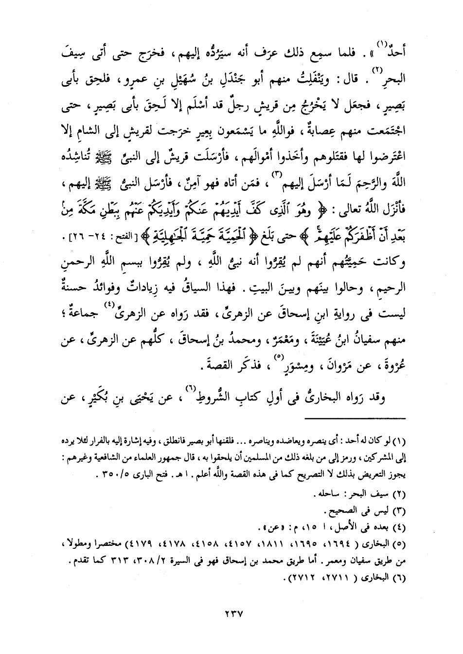 أَحَدٌ ". فَلَمَّا سَمِعَ ذَلِكَ عَرَفَ أَنَّهُ سَيَرُدُّهُ إِلَيْهِمْ، فَخَرَجَ حَتَّى أَتَى سَيْفَ الْبَحْرِ. قَالَ: وَيَنْفَلِتُ مِنْهُمْ أَبُو جَنْدَلِ بْنُ سُهَيْلِ بْنِ عَمْرٍو، فَلَحِقَ بِأَبِي بَصِيرٍ، فَجَعَلَ لَا يَخْرُجُ مِنْ قُرَيْشٍ رَجُلٌ قَدْ أَسْلَمَ إِلَّا لَحِقَ بِأَبِي بَصِيرٍ، حَتَّى اجْتَمَعَتْ مِنْهُمْ عِصَابَةٌ، فَوَاللَّهِ مَا يَسْمَعُونَ بِعِيرٍ خَرَجَتْ لِقُرَيْشٍ إِلَى الشَّامِ إِلَّا اعْتَرَضُوا لَهَا فَقَتَلُوهُمْ وَأَخَذُوا أَمْوَالَهُمْ، فَأَرْسَلَتْ قُرَيْشٌ إِلَى النَّبِيِّ صَلَّى اللَّهُ عَلَيْهِ وَسَلَّمَ تُنَاشِدُهُ اللَّهَ وَالرَّحِمَ لَمَا أَرْسَلَ إِلَيْهِمْ، فَمَنْ أَتَاهُ فَهُوَ آمِنٌ، فَأَرْسَلَ النَّبِيُّ صَلَّى اللَّهُ عَلَيْهِ وَسَلَّمَ إِلَيْهِمْ، فَأَنْزَلَ اللَّهُ تَعَالَى: {وَهُوَ الَّذِي كَفَّ أَيْدِيَهُمْ عَنْكُمْ وَأَيْدِيَكُمْ عَنْهُمْ بِبَطْنِ مَكَّةَ مِنْ بَعْدِ أَنْ أَظْفَرَكُمْ عَلَيْهِمْ} [الفتح: 24] حَتَّى بَلَغَ {الْحَمِيَّةَ حَمِيَّةَ الْجَاهِلِيَّةِ} [الفتح: 26] (الْفَتْحِ: 24 26) . وَكَانَتْ حَمِيَّتُهُمْ أَنَّهُمْ لَمْ يُقِرُّوا أَنَّهُ نَبِيُّ اللَّهِ، وَلَمْ يُقِرُّوا بِبِسْمِ اللَّهِ الرَّحْمَنِ الرَّحِيمِ، وَحَالُوا بَيْنَهُمْ وَبَيْنَ الْبَيْتِ.» فَهَذَا السِّيَاقُ فِيهِ زِيَادَاتٌ وَفَوَائِدُ حَسَنَةٌ لَيْسَتْ فِي رِوَايَةِ ابْنِ إِسْحَاقَ عَنِ الزُّهْرِيِّ، فَقَدْ رَوَاهُ عَنِ الزُّهْرِيِّ جَمَاعَةٌ؛ مِنْهُمْ سُفْيَانُ بْنُ عُيَيْنَةَ، وَمَعْمَرٌ، وَمُحَمَّدُ بْنُ إِسْحَاقَ، كُلُّهُمْ عَنِ الزُّهْرِيِّ، عَنْ عُرْوَةَ، عَنْ مَرْوَانَ وَمِسْوَرٍ، فَذَكَرَ الْقِصَّةَ.