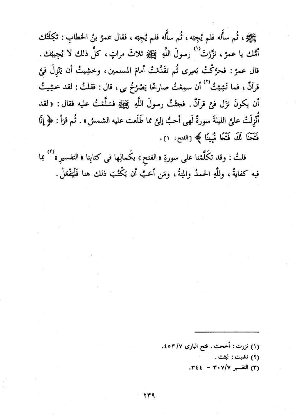 صَلَّى اللَّهُ عَلَيْهِ وَسَلَّمَ، ثُمَّ سَأَلَهُ فَلَمْ يُجِبْهُ، ثُمَّ سَأَلَهُ فَلَمْ يُجِبْهُ، فَقَالَ عُمَرُ بْنُ الْخَطَّابِ ثَكِلَتْكَ أُمُّكَ يَا عُمَرُ، نَزَّرْتَ رَسُولَ اللَّهِ صَلَّى اللَّهُ عَلَيْهِ وَسَلَّمَ ثَلَاثَ مَرَّاتٍ، كُلُّ ذَلِكَ لَا يُجِيبُكَ. قَالَ عُمَرُ: فَحَرَّكْتُ بَعِيرِي ثُمَّ تَقَدَّمْتُ أَمَامَ الْمُسْلِمِينَ، وَخَشِيتُ أَنْ يَنْزِلَ فِيَّ قُرْآنٌ، فَمَا نَشِبْتُ أَنْ سَمِعْتُ صَارِخًا يَصْرُخُ بِي، قَالَ: فَقُلْتُ: لَقَدْ خَشِيتُ أَنْ يَكُونَ نَزَلَ فِيَّ قُرْآنٌ، فَجِئْتُ رَسُولَ اللَّهِ صَلَّى اللَّهُ عَلَيْهِ وَسَلَّمَ فَسَلَّمْتُ عَلَيْهِ فَقَالَ: " لَقَدْ أُنْزِلَتْ عَلَيَّ اللَّيْلَةَ سُورَةٌ لَهِيَ أَحَبُّ إِلَيَّ مِمَّا طَلَعَتْ عَلَيْهِ الشَّمْسُ ". ثُمَّ قَرَأَ: {إِنَّا فَتَحْنَا لَكَ فَتْحًا مُبِينًا} [الفتح: 1] (الْفَتْحِ 1) » .