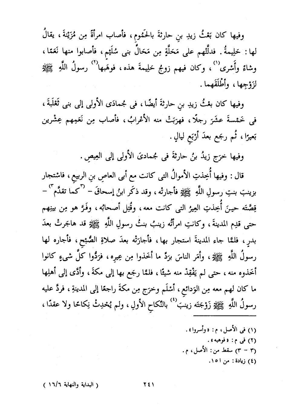 وَفِيهَا كَانَ بَعْثُ زَيْدِ بْنِ حَارِثَةَ بِالْحَمُومِ، فَأَصَابَ امْرَأَةً مِنْ مُزَيْنَةَ، يُقَالُ لَهَا: حَلِيمَةُ. فَدَلَّتْهُمْ عَلَى مَحَلَّةٍ مِنْ مَحَالِّ بَنِي سُلَيْمٍ، فَأَصَابُوا مِنْهَا نَعَمًا، وَشَاءً وَأَسْرَى، وَكَانَ فِيهِمْ زَوْجُ حَلِيمَةَ هَذِهِ، فَوَهَبَهَا رَسُولُ اللَّهِ صَلَّى اللَّهُ عَلَيْهِ وَسَلَّمَ لِزَوْجِهَا، وَأَطْلَقَهُمَا.