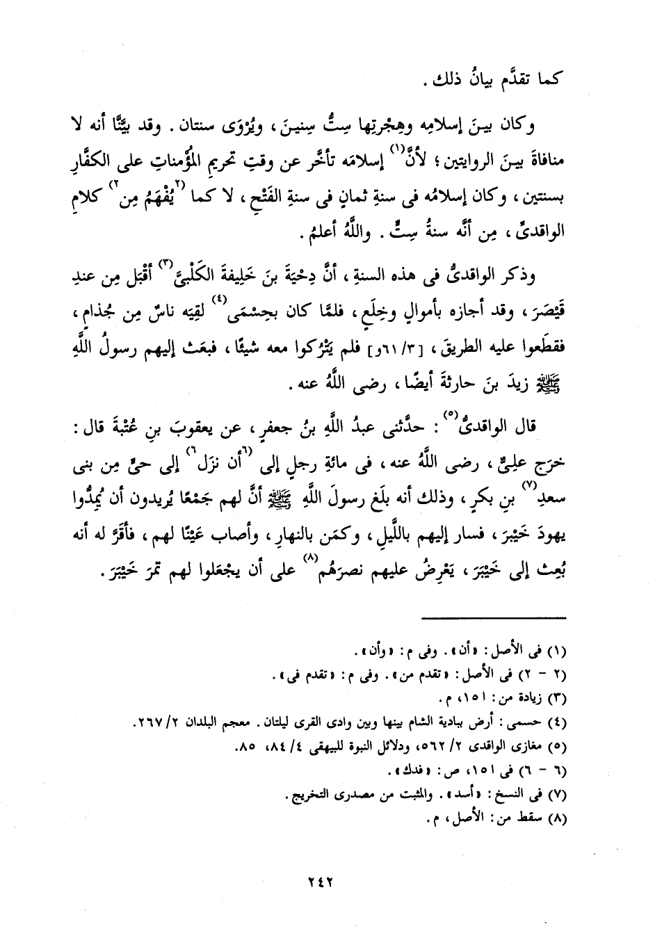 وَكَانَ بَيْنَ إِسْلَامِهِ وَهِجْرَتِهَا سِتُّ سِنِينَ، وَيُرْوَى سَنَتَانِ. وَقَدْ بَيَّنَّا أَنَّهُ لَا مُنَافَاةَ بَيْنَ الرِّوَايَتَيْنِ؛ لِأَنَّ إِسْلَامَهُ تَأَخَّرَ عَنْ وَقْتِ تَحْرِيمِ الْمُؤْمِنَاتِ عَلَى الْكَفَّارِ بِسَنَتَيْنِ، وَكَانَ إِسْلَامُهُ فِي سَنَةِ ثَمَانٍ فِي سَنَةِ الْفَتْحِ، لَا كَمَا يُفْهَمُ مِنْ كَلَامِ الْوَاقِدِيِّ، مِنْ أَنَّهُ سَنَةَ سِتٍّ. وَاللَّهُ أَعْلَمُ.