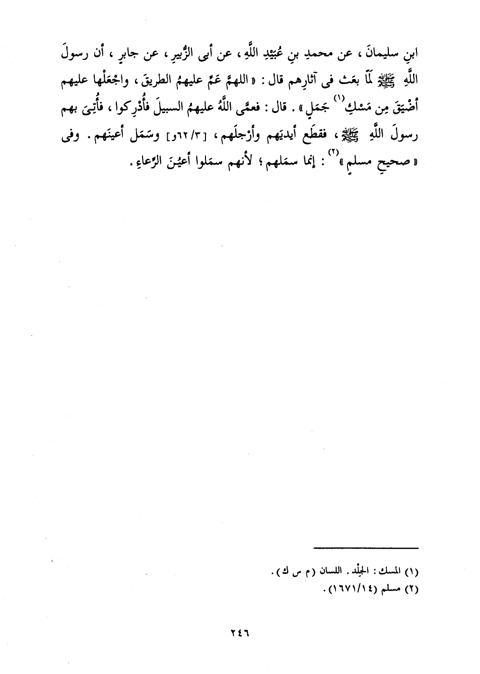 بْنِ سُلَيْمَانَ، عَنْ مُحَمَّدِ بْنِ عُبَيْدِ اللَّهِ، عَنْ أَبِي الزُّبَيْرِ، عَنْ جَابِرٍ، «أَنَّ رَسُولَ اللَّهِ صَلَّى اللَّهُ عَلَيْهِ وَسَلَّمَ لَمَّا بَعَثَ فِي آثَارِهِمْ قَالَ: " اللَّهُمَّ عَمِّ عَلَيْهِمُ الطَّرِيقَ، وَاجْعَلْهَا عَلَيْهِمْ أَضْيَقَ مِنْ مَسْكِ جَمَلٍ ". قَالَ: فَعَمَّى اللَّهُ عَلَيْهِمُ السَّبِيلَ فَأُدْرِكُوا، فَأُتِيَ بِهِمْ رَسُولَ اللَّهِ صَلَّى اللَّهُ عَلَيْهِ وَسَلَّمَ، فَقَطَعَ أَيْدِيَهِمْ وَأَرْجُلَهُمْ، وَسَمَلَ أَعْيُنَهُمْ» وَفِي " صَحِيحِ مُسْلِمٍ ": إِنَّمَا سَمَلَهُمْ؛ لِأَنَّهُمْ سَمَلُوا أَعْيُنَ الرِّعَاءِ.