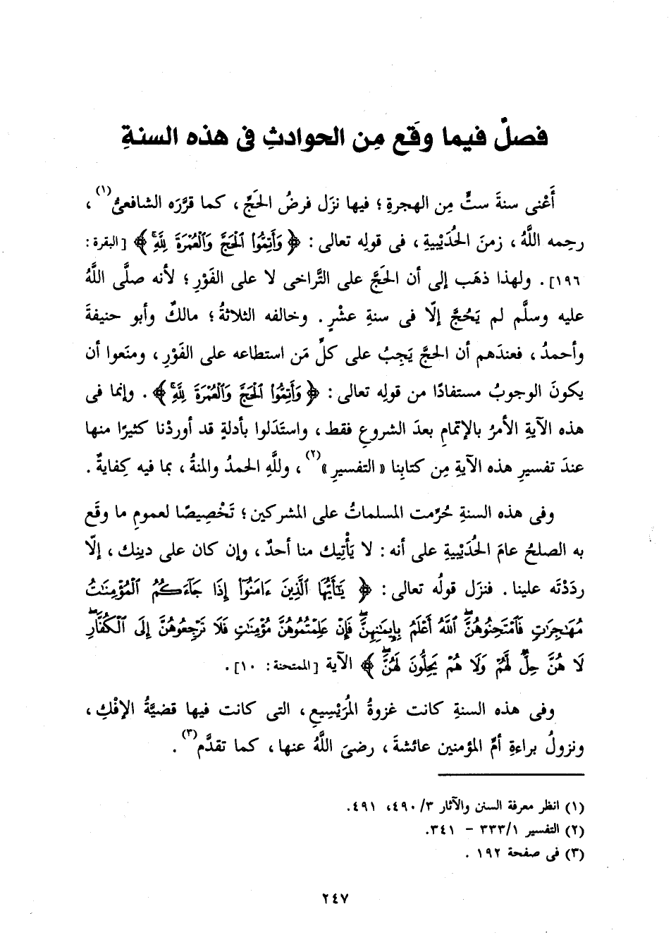 أَعْنِي سَنَةَ سِتٍّ مِنَ الْهِجْرَةِ؛ فِيهَا نَزَلَ فَرْضُ الْحَجِّ، كَمَا قَرَّرَهُ الشَّافِعِيُّ، رَحِمَهُ اللَّهُ، زَمَنَ الْحُدَيْبِيَةِ فِي قَوْلِهِ تَعَالَى: {وَأَتِمُّوا الْحَجَّ وَالْعُمْرَةَ لِلَّهِ} [البقرة: 196] (الْبَقَرَةِ: 196) وَلِهَذَا ذَهَبَ إِلَى أَنَّ الْحَجَّ عَلَى التَّرَاخِي لَا عَلَى الْفَوْرِ؛ لِأَنَّهُ صَلَّى اللَّهُ عَلَيْهِ وَسَلَّمَ لَمْ يَحُجَّ إِلَّا فِي سَنَةِ عَشْرٍ. وَخَالَفَهُ الثَّلَاثَةُ؛ مَالِكٌ وَأَبُو حَنِيفَةَ وَأَحْمَدُ فَعِنْدَهُمْ أَنَّ الْحَجَّ يَجِبُ عَلَى كُلِّ مَنِ اسْتَطَاعَهُ عَلَى الْفَوْرِ، وَمَنَعُوا أَنْ يَكُونَ الْوُجُوبُ مُسْتَفَادًا مِنْ قَوْلِهِ تَعَالَى: {وَأَتِمُّوا الْحَجَّ وَالْعُمْرَةَ لِلَّهِ} [البقرة: 196] وَإِنَّمَا فِي هَذِهِ الْآيَةِ الْأَمْرُ بِالْإِتْمَامِ بَعْدَ الشُّرُوعِ فَقَطْ، وَاسْتَدَلُّوا بِأَدِلَّةٍ قَدْ أَوْرَدْنَا كَثِيرًا مِنْهَا عِنْدَ تَفْسِيرِ هَذِهِ الْآيَةِ مِنْ كِتَابِنَا " التَّفْسِيرِ "، وَلِلَّهِ الْحَمْدُ وَالْمِنَّةُ، بِمَا فِيهِ الْكِفَايَةُ.