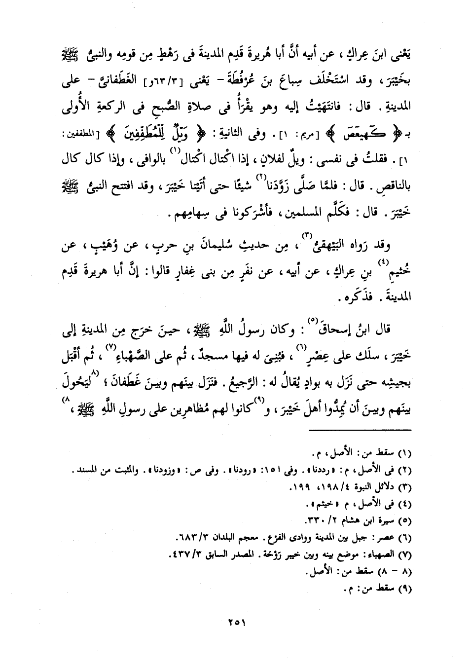 يَعْنِي ابْنَ عِرَاكٍ، عَنْ أَبِيهِ «أَنَّ أَبَا هُرَيْرَةَ قَدِمَ الْمَدِينَةَ فِي رَهْطٍ مِنْ قَوْمِهِ وَالنَّبِيُّ صَلَّى اللَّهُ عَلَيْهِ وَسَلَّمَ بِخَيْبَرَ، وَقَدِ اسْتَخْلَفَ سِبَاعَ بْنَ عُرْفُطَةَ - يَعْنِي الْغَطَفَانِيَّ - عَلَى الْمَدِينَةِ. قَالَ: فَانْتَهَيْتُ إِلَيْهِ وَهُوَ يَقْرَأُ فِي صَلَاةِ الصُّبْحِ فِي الرَّكْعَةِ الْأُولَى بِ {كهيعص} [مريم: 1] (مَرْيَمَ: 1) . وَفِي الثَّانِيَةِ: {وَيْلٌ لِلْمُطَفِّفِينَ} [المطففين: 1] (الْمُطَفِّفِينَ: 1) فَقُلْتُ فِي نَفْسِي: وَيْلٌ لِفُلَانٍ، إِذَا اكْتَالَ اكْتَالَ بِالْوَافِي، وَإِذَا كَالَ كَالَ بِالنَّاقِصِ. قَالَ: فَلَمَّا صَلَّى زَوَّدَنَا شَيْئًا حَتَّى أَتَيْنَا خَيْبَرَ، وَقَدِ افْتَتَحَ النَّبِيُّ صَلَّى اللَّهُ عَلَيْهِ وَسَلَّمَ خَيْبَرَ. قَالَ: فَكَلَّمَ الْمُسْلِمِينَ، فَأَشْرَكُونَا فِي سِهَامِهِمْ» .