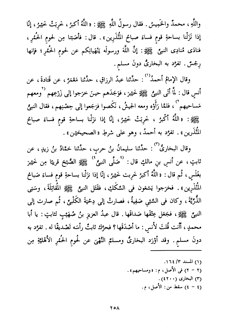 وَقَالَ الْبُخَارِيُّ: حَدَّثَنَا سُلَيْمَانُ بْنُ حَرْبٍ، حَدَّثَنَا حَمَّادُ بْنُ زَيْدٍ، عَنْ ثَابِتٍ، عَنْ أَنَسِ بْنِ مَالِكٍ قَالَ: «صَلَّى النَّبِيُّ صَلَّى اللَّهُ عَلَيْهِ وَسَلَّمَ الصُّبْحَ قَرِيبًا مِنْ خَيْبَرَ بِغَلَسٍ، ثُمَّ قَالَ: " اللَّهُ أَكْبَرُ خَرِبَتْ خَيْبَرُ إِنَّا إِذَا نَزَلْنَا بِسَاحَةِ قَوْمٍ فَسَاءَ صَبَاحُ الْمُنْذَرِينَ ". فَخَرَجُوا يَسْعَوْنَ فِي السِّكَكِ، فَقَتَلَ النَّبِيُّ صَلَّى اللَّهُ عَلَيْهِ وَسَلَّمَ الْمُقَاتِلَةَ، وَسَبَى الذُّرِّيَّةَ، وَكَانَ فِي السَّبْيِ صَفِيَّةُ، فَصَارَتْ إِلَى دِحْيَةَ الْكَلْبِيِّ، ثُمَّ صَارَتْ إِلَى النَّبِيِّ صَلَّى اللَّهُ عَلَيْهِ وَسَلَّمَ، فَجَعَلَ عِتْقَهَا صَدَاقَهَا. قَالَ عَبْدُ الْعَزِيزِ بْنُ صُهَيْبٍ لِثَابِتٍ: يَا أَبَا مُحَمَّدٍ، أَأَنْتَ قُلْتَ لِأَنَسٍ: مَا أَصْدَقَهَا؟ فَحَرَّكَ ثَابِتٌ رَأْسَهُ تَصْدِيقًا لَهُ» . تَفَرَّدَ بِهِ دُونَ مُسْلِمٍ. وَقَدْ أَوْرَدَ الْبُخَارِيُّ وَمُسْلِمٌ النَّهْيَ عَنْ لُحُومِ الْحُمُرِ الْأَهْلِيَّةِ مِنْ
