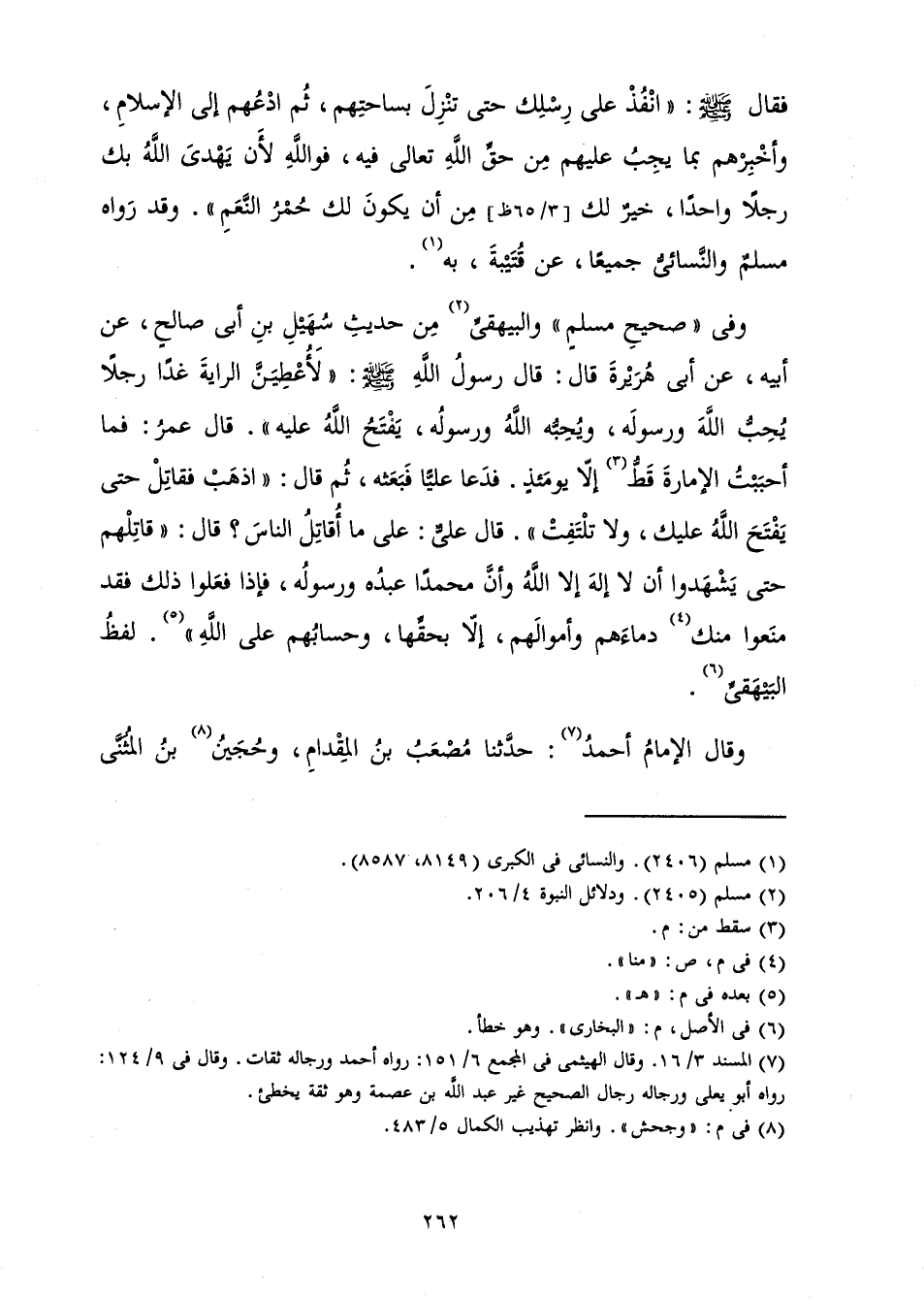 فَقَالَ صَلَّى اللَّهُ عَلَيْهِ وَسَلَّمَ: " انْفُذْ عَلَى رِسْلِكَ حَتَّى تَنْزِلَ بِسَاحَتِهِمْ، ثُمَّ ادْعُهُمْ إِلَى الْإِسْلَامِ، وَأَخْبِرْهُمْ بِمَا يَجِبُ عَلَيْهِمْ مِنْ حَقِّ اللَّهِ تَعَالَى فِيهِ، فَوَاللَّهِ لَأَنْ يَهْدِيَ اللَّهُ بِكَ رَجُلًا وَاحِدًا خَيْرٌ لَكَ مِنْ أَنْ يَكُونَ لَكَ حُمُرُ النَّعَمِ» وَقَدْ رَوَاهُ مُسْلِمٌ والنَّسَائِيُّ جَمِيعًا، عَنْ قُتَيْبَةَ، بِهِ.