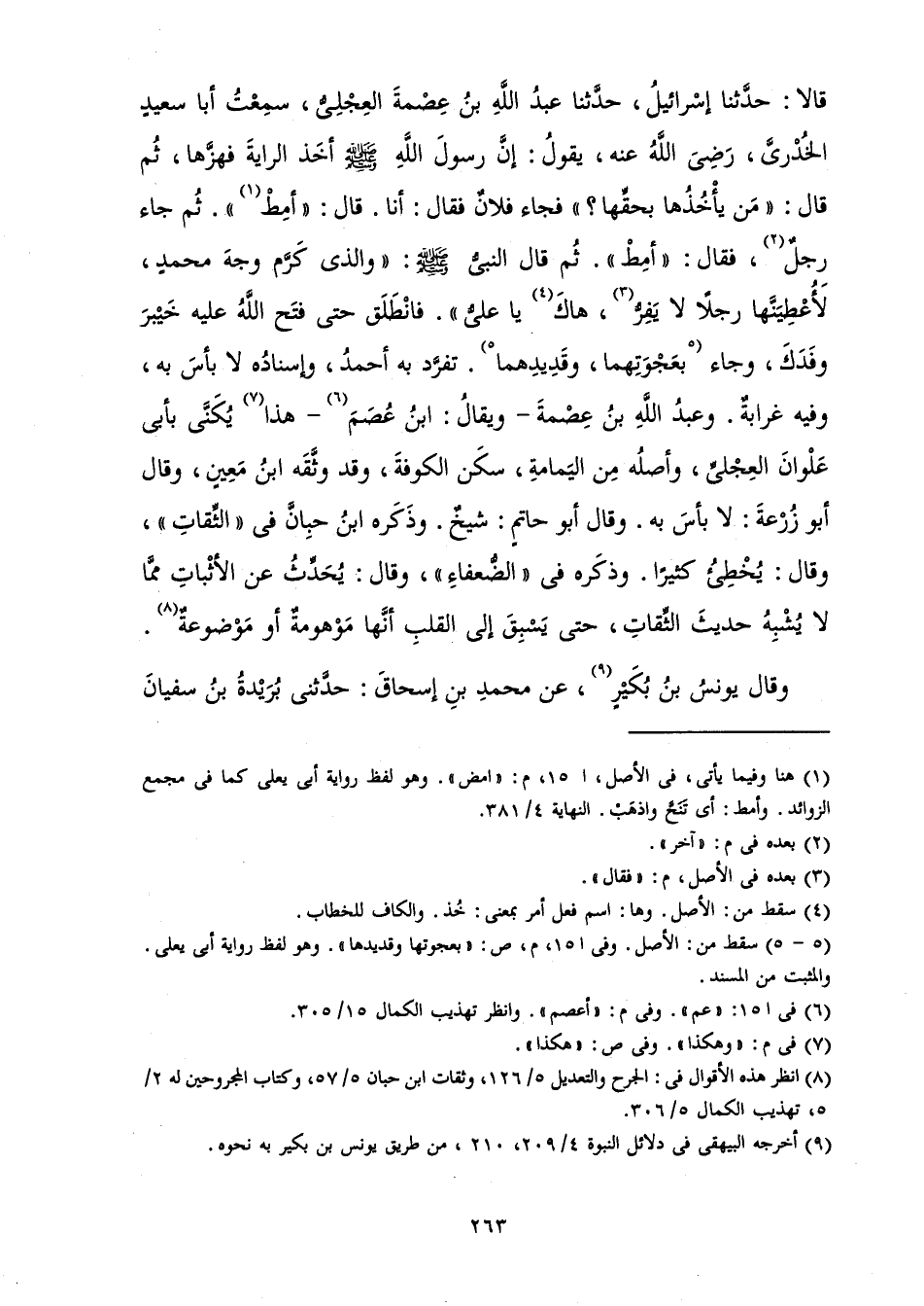قَالَا: حَدَّثَنَا إِسْرَائِيلُ، حَدَّثَنَا عَبْدُ اللَّهِ بْنُ عِصْمَةَ الْعِجْلِيُّ، سَمِعْتُ أَبَا سَعِيدٍ الْخُدْرِيَّ، رَضِيَ اللَّهُ عَنْهُ، يَقُولُ: «إِنَّ رَسُولَ اللَّهِ صَلَّى اللَّهُ عَلَيْهِ وَسَلَّمَ أَخَذَ الرَّايَةَ فَهَزَّهَا، ثُمَّ قَالَ: " مَنْ يَأْخُذُهَا بِحَقِّهَا؟ " فَجَاءَ فُلَانٌ فَقَالَ: أَنَا. قَالَ: " أَمِطْ ". ثُمَّ جَاءَ رَجُلٌ، فَقَالَ: " أَمِطْ ". ثُمَّ قَالَ النَّبِيُّ صَلَّى اللَّهُ عَلَيْهِ وَسَلَّمَ: " وَالَّذِي كَرَّمَ وَجْهَ مُحَمَّدٍ، لَأُعْطِيَنَّهَا رَجُلًا لَا يَفِرُّ، هَاكَ يَا عَلِيُّ ". فَانْطَلَقَ حَتَّى فَتَحَ اللَّهُ عَلَيْهِ خَيْبَرَ وَفَدَكَ، وَجَاءَ بِعَجْوَتِهِمَا، وَقَدِيدِهِمَا» . تَفَرَّدَ بِهِ أَحْمَدُ، وَإِسْنَادُهُ لَا بَأْسَ بِهِ، وَفِيهِ غَرَابَةٌ. وَعَبْدُ اللَّهِ بْنُ عِصْمَةَ - وَيُقَالُ: ابْنُ عُصَمَ - هَذَا يُكَنَّى بِأَبِي عَلْوَانَ الْعِجْلِيِّ، وَأَصْلُهُ مِنَ الْيَمَامَةِ، سَكَنَ الْكُوفَةَ، وَقَدْ وَثَّقَهُ ابْنُ مَعِينٍ، وَقَالَ أَبُو زُرْعَةَ لَا بَأْسَ بِهِ. وَقَالَ أَبُو حَاتِمٍ: شَيْخٌ. وَذَكَرَهُ ابْنُ حِبَانَ فِي " الثِّقَاتِ "، وَقَالَ: يُخْطِئُ كَثِيرًا. وَذَكَرَهُ فِي " الضُّعَفَاءِ "، وَقَالَ: يُحَدِّثُ عَنِ الْأَثْبَاتِ مِمَّا لَا يُشْبِهُ حَدِيثَ الثِّقَاتِ، حَتَّى يَسْبِقَ إِلَى الْقَلْبِ أَنَّهَا مَوْهُومَةٌ أَوْ مَوْضُوعَةٌ.