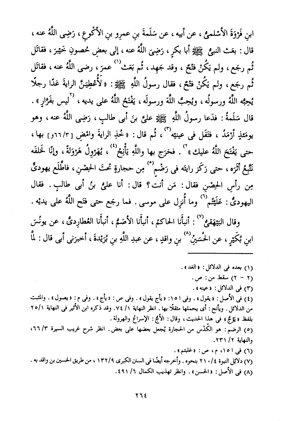 بْنِ فَرْوَةَ الْأَسْلَمِيُّ، عَنْ أَبِيهِ، عَنْ سَلَمَةَ بْنِ عَمْرِو بْنِ الْأَكْوَعِ، رَضِيَ اللَّهُ عَنْهُ، قَالَ: «بَعَثَ النَّبِيُّ صَلَّى اللَّهُ عَلَيْهِ وَسَلَّمَ أَبَا بَكْرٍ، رَضِيَ اللَّهُ عَنْهُ، إِلَى بَعْضِ حُصُونِ خَيْبَرَ، فَقَاتَلَ ثُمَّ رَجَعَ، وَلَمْ يَكُنْ فَتْحٌ، وَقَدْ جَهِدَ، ثُمَّ بَعَثَ عُمَرَ رَضِيَ اللَّهُ عَنْهُ، فَقَاتَلَ ثُمَّ رَجَعَ، وَلَمْ يَكُنْ فَتْحٌ، فَقَالَ رَسُولُ اللَّهِ صَلَّى اللَّهُ عَلَيْهِ وَسَلَّمَ: " لَأُعْطِيَنَّ الرَّايَةَ غَدًا رَجُلًا يُحِبُّهُ اللَّهُ وَرَسُولُهُ، وَيُحِبُّ اللَّهَ وَرَسُولَهُ، يَفْتَحُ اللَّهُ عَلَى يَدَيْهِ، لَيْسَ بِفَرَّارٍ ". قَالَ سَلَمَةُ: فَدَعَا رَسُولُ اللَّهِ صَلَّى اللَّهُ عَلَيْهِ وَسَلَّمَ عَلِيَّ بْنَ أَبِي طَالِبٍ، رَضِيَ اللَّهُ عَنْهُ، وَهُوَ يَوْمَئِذٍ أَرْمَدُ، فَتَفَلَ فِي عَيْنَيْهِ، ثُمَّ قَالَ: " خُذِ الرَّايَةَ وَامْضِ بِهَا، حَتَّى يَفْتَحَ اللَّهُ عَلَيْكَ ". فَخَرَجَ بِهَا وَاللَّهِ يَأْنِحُ، يُهَرْوِلُ هَرْوَلَةً، وَإِنَّا لَخَلْفَهُ نَتَّبِعُ أَثَرَهُ، حَتَّى رَكَزَ رَايَتَهُ فِي رَضْمٍ مِنْ حِجَارَةٍ تَحْتَ الْحِصْنِ، فَاطَّلَعَ يَهُودِيٌّ مِنْ رَأْسِ الْحِصْنِ فَقَالَ: مَنْ أَنْتَ؟ قَالَ: أَنَا عَلِيُّ بْنُ أَبِي طَالِبٍ فَقَالَ الْيَهُودِيُّ: عَلَيْتُمْ وَمَا أُنْزِلَ عَلَى مُوسَى. فَمَا رَجَعَ حَتَّى فَتَحَ اللَّهُ عَلَى يَدَيْهِ» .