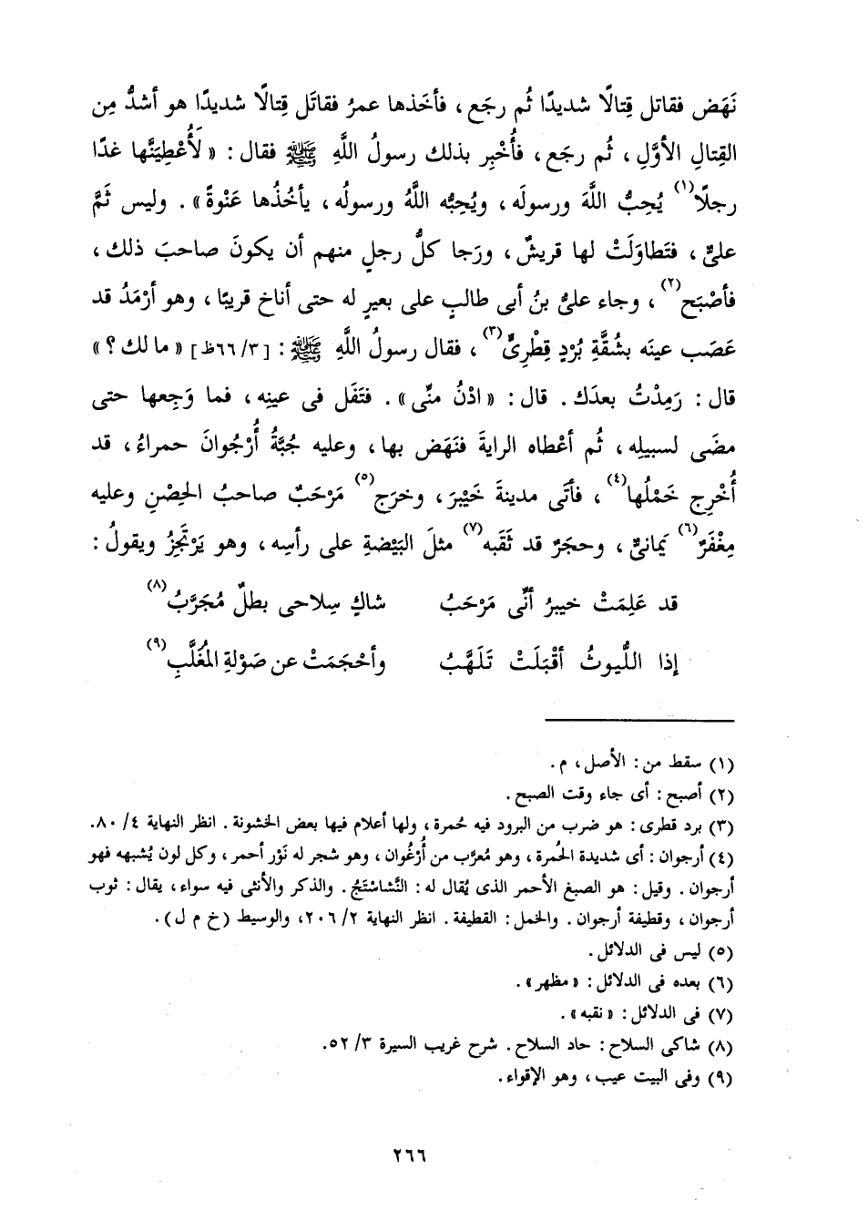 نَهَضَ فَقَاتَلَ قِتَالًا شَدِيدًا ثُمَّ رَجَعَ، فَأَخَذَهَا عُمَرُ فَقَاتَلَ قِتَالًا شَدِيدًا هُوَ أَشَدُّ مِنَ الْقِتَالِ الْأَوَّلِ، ثُمَّ رَجَعَ، فَأُخْبِرَ بِذَلِكَ رَسُولُ اللَّهِ صَلَّى اللَّهُ عَلَيْهِ وَسَلَّمَ فَقَالَ: " لَأُعْطِيَنَّهَا غَدًا رَجُلًا يُحِبُّ اللَّهَ وَرَسُولَهُ، وَيُحِبُّهُ اللَّهُ وَرَسُولُهُ، يَأْخُذُهَا عَنْوَةً ". وَلَيْسَ ثَمَّ عَلِيٌّ، فَتَطَاوَلَتْ لَهَا قُرَيْشٌ، وَرَجَا كُلُّ رَجُلٍ مِنْهُمْ أَنْ يَكُونَ صَاحِبَ ذَلِكَ، فَأَصْبَحَ، وَجَاءَ عَلِيُّ بْنُ أَبِي طَالِبٍ عَلَى بَعِيرٍ لَهُ حَتَّى أَنَاخَ قَرِيبًا، وَهُوَ أَرْمَدُ قَدْ عَصَبَ عَيْنَهُ بِشُقَّةِ بُرْدٍ قِطْرِيٍّ، فَقَالَ رَسُولُ اللَّهِ صَلَّى اللَّهُ عَلَيْهِ وَسَلَّمَ: " مَا لَكَ؟ " قَالَ: رَمِدْتُ بَعْدَكَ. قَالَ: " ادْنُ مِنِّي " فَتَفَلَ فِي عَيْنِهِ، فَمَا وَجِعَهَا حَتَّى مَضَى لِسَبِيلِهِ، ثُمَّ أَعْطَاهُ الرَّايَةَ فَنَهَضَ بِهَا، وَعَلَيْهِ جُبَّةُ أُرْجُوَانَ حَمْرَاءُ، قَدْ أُخْرِجَ خَمْلُهَا، فَأَتَى مَدِينَةَ خَيْبَرَ وَخَرَجَ مَرْحَبٌ صَاحِبُ الْحِصْنِ وَعَلَيْهِ مِغْفَرٌ يَمَانِيٌّ، وَحَجَرٌ قَدْ ثَقَبَهُ مِثْلَ الْبَيْضَةِ عَلَى رَأْسِهِ، وَهُوَ يَرْتَجِزُ وَيَقُولُ: