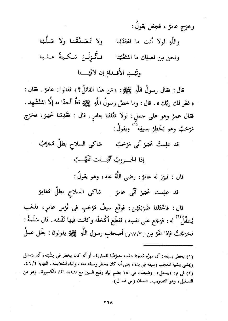 قَالَ: فَبَرَزَ لَهُ عَامِرٌ، رَضِيَ اللَّهُ عَنْهُ، وَهُوَ يَقُولُ: