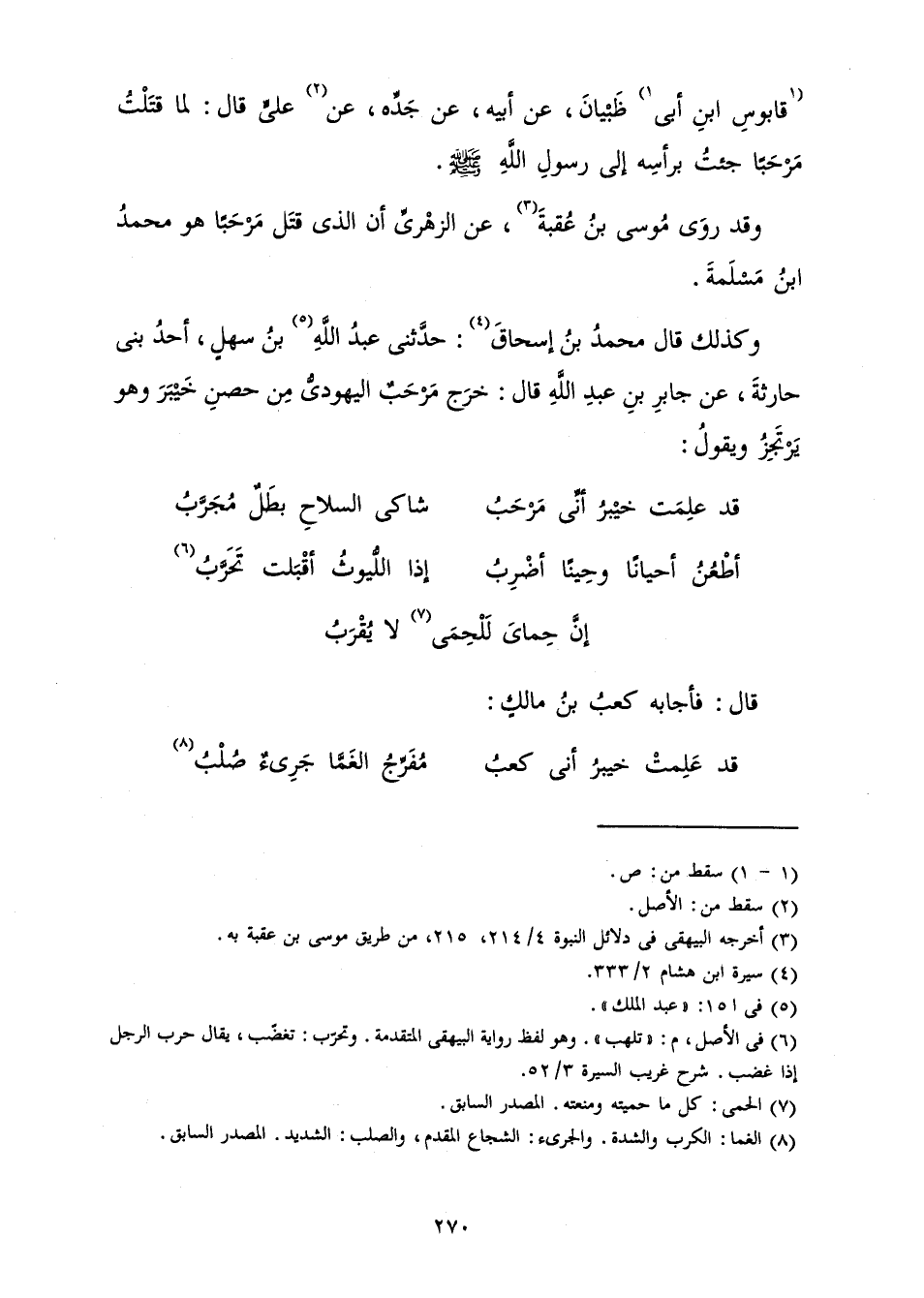 وَكَذَلِكَ قَالَ مُحَمَّدُ بْنُ إِسْحَاقَ: حَدَّثَنِي عَبْدُ اللَّهِ بْنُ سَهْلٍ، أَحَدُ بَنِي حَارِثَةَ، عَنْ جَابِرِ بْنِ عَبْدِ اللَّهِ قَالَ: «خَرَجَ مَرْحَبٌ الْيَهُودِيُّ مِنْ حِصْنِ خَيْبَرَ وَهُوَ يَرْتَجِزُ وَيَقُولُ: