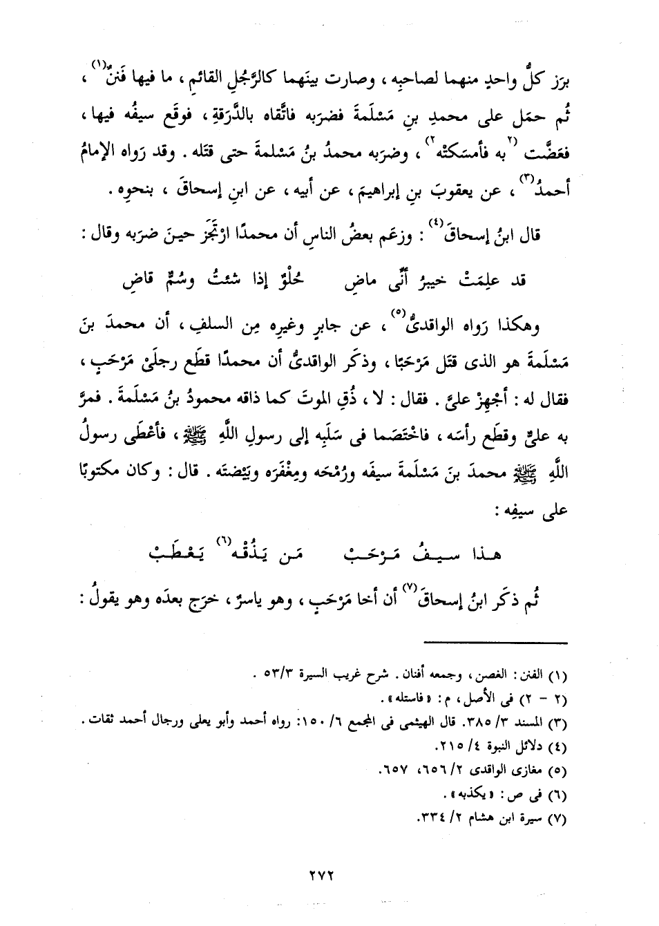 وَهَكَذَا رَوَاهُ الْوَاقِدِيُّ، عَنْ جَابِرٍ وَغَيْرِهِ مِنَ السَّلَفِ، أَنَّ مُحَمَّدَ بْنَ مَسْلَمَةَ هُوَ الَّذِي قَتَلَ مَرْحَبًا، وَذَكَرَ الْوَاقِدِيُّ أَنَّ مُحَمَّدًا قَطَعَ رِجْلَيْ مَرْحَبٍ، فَقَالَ لَهُ: أَجْهِزْ عَلَيَّ. فَقَالَ: لَا، ذُقِ الْمَوْتَ كَمَا ذَاقَهُ مَحْمُودُ بْنُ مَسْلَمَةَ. فَمَرَّ بِهِ عَلِيٌّ وَقَطَعَ رَأْسُهُ، فَاخْتَصَمَا فِي سَلَبِهِ إِلَى رَسُولِ اللَّهِ صَلَّى اللَّهُ عَلَيْهِ وَسَلَّمَ، فَأَعْطَى رَسُولُ اللَّهِ صَلَّى اللَّهُ عَلَيْهِ وَسَلَّمَ مُحَمَّدَ بْنَ مَسْلَمَةَ سَيْفَهُ وَرُمْحَهُ وَمِغْفَرَهُ وَبَيْضَتَهُ. قَالَ: وَكَانَ مَكْتُوبًا عَلَى سَيْفِهِ: