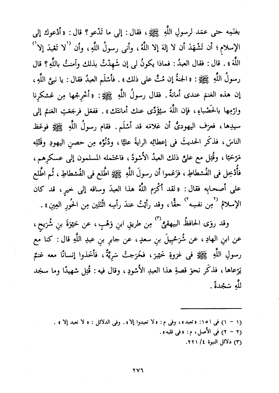 وَقَدْ رَوَى الْحَافِظُ الْبَيْهَقِيُّ مِنْ طَرِيقِ ابْنِ وَهْبٍ، عَنْ حَيْوَةَ بْنِ شُرَيْحٍ، عَنِ ابْنِ الْهَادِ، عَنْ شُرَحْبِيلَ بْنِ سَعْدٍ، عَنْ جَابِرِ بْنِ عَبْدِ اللَّهِ قَالَ: كُنَّا مَعَ رَسُولِ اللَّهِ صَلَّى اللَّهُ عَلَيْهِ وَسَلَّمَ فِي غَزْوَةِ خَيْبَرَ، فَخَرَجَتْ سَرِيَّةٌ، فَأَخَذُوا إِنْسَانًا مَعَهُ غَنَمٌ يَرْعَاهَا، فَذَكَرَ نَحْوَ قِصَّةِ هَذَا الْعَبْدِ الْأَسْوَدِ، وَقَالَ فِيهِ: قُتِلَ شَهِيدًا وَمَا سَجَدَ لِلَّهِ سَجْدَةً.