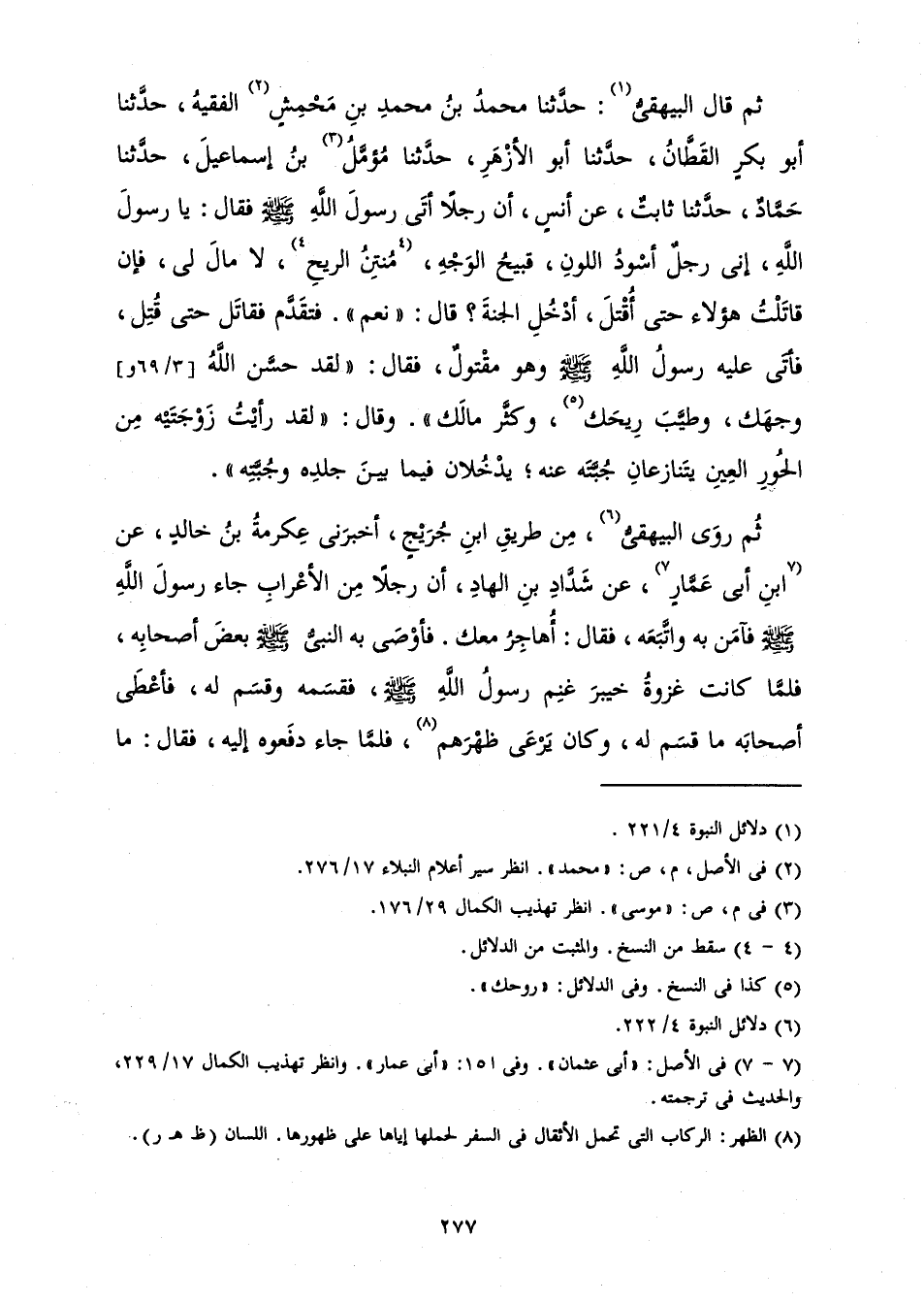 ثُمَّ قَالَ الْبَيْهَقِيُّ: حَدَّثَنَا مُحَمَّدُ بْنُ مُحَمَّدِ بْنِ مَحْمِشٍ الْفَقِيهُ، حَدَّثَنَا أَبُو بَكْرٍ الْقَطَّانُ، حَدَّثَنَا أَبُو الْأَزْهَرِ، حَدَّثَنَا مُؤَمَّلُ بْنُ إِسْمَاعِيلَ، حَدَّثَنَا حَمَّادٌ، حَدَّثَنَا ثَابِتٌ، عَنْ أَنَسٍ «أَنَّ رَجُلًا أَتَى رَسُولَ اللَّهِ صَلَّى اللَّهُ عَلَيْهِ وَسَلَّمَ فَقَالَ: يَا رَسُولَ اللَّهِ، إِنِّي رَجُلٌ أَسْوَدُ اللَّوْنِ، قَبِيحُ الْوَجْهِ، مُنْتِنُ الرِّيحِ، لَا مَالَ لِي، فَإِنْ قَاتَلْتُ هَؤُلَاءِ حَتَّى أُقْتَلَ، أَدْخُلُ الْجَنَّةَ؟ قَالَ: " نَعَمْ ". فَتَقَدَّمَ فَقَاتَلَ حَتَّى قُتِلَ، فَأَتَى عَلَيْهِ رَسُولُ اللَّهِ صَلَّى اللَّهُ عَلَيْهِ وَسَلَّمَ وَهُوَ مَقْتُولٌ، فَقَالَ: " لَقَدْ حَسَّنَ اللَّهُ وَجْهَكَ الطَّيِّبَ، وَطَيَّبَ رِيحَكَ، وَكَثَّرَ مَالَكَ " وَقَالَ: " لَقَدْ رَأَيْتُ زَوْجَتَيْهِ مِنَ الْحُورِ الْعِينِ يَتَنَازَعَانِ جُبَّتَهُ عَنْهُ؛ يَدْخُلَانِ فِيمَا بَيْنَ جِلْدِهِ وَجُبَّتِهِ» .