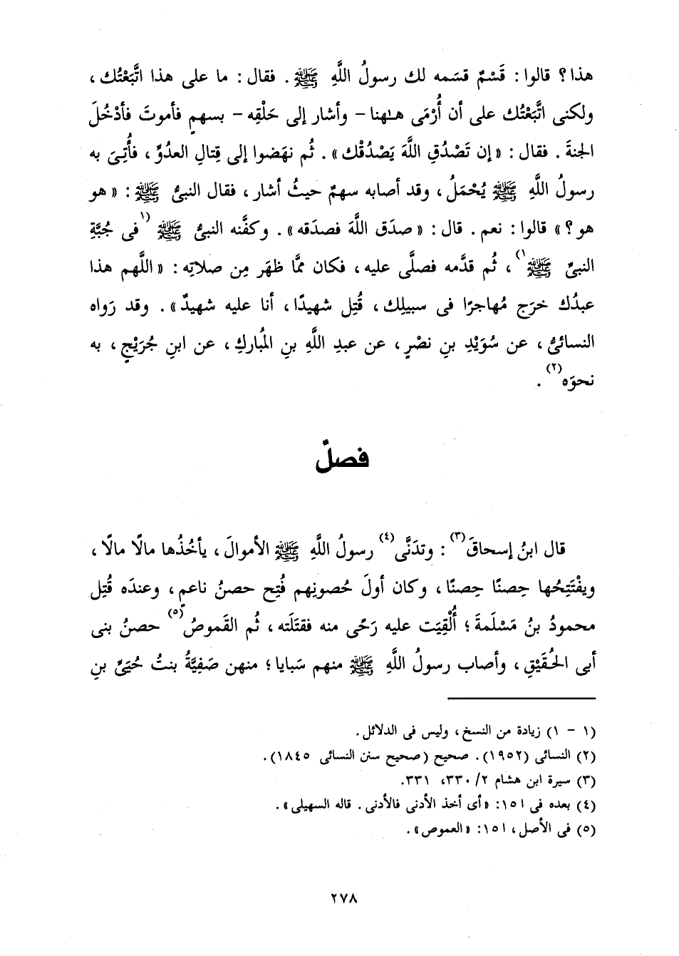 هَذَا؟ قَالُوا: قَسْمٌ قَسَمَهُ لَكَ رَسُولُ اللَّهِ صَلَّى اللَّهُ عَلَيْهِ وَسَلَّمَ. فَقَالَ: مَا عَلَى هَذَا اتَّبَعْتُكَ، وَلَكِنِّي اتَّبَعْتُكَ عَلَى أَنْ أُرْمَى هَاهُنَا - وَأَشَارَ إِلَى حَلْقِهِ - بِسَهْمٍ فَأَمُوتَ فَأَدْخُلَ الْجَنَّةَ. فَقَالَ: " إِنْ تَصْدُقِ اللَّهَ يَصْدُقْكَ " ثُمَّ نَهَضُوا إِلَى قِتَالِ الْعَدُوِّ، فَأُتِيَ بِهِ رَسُولَ اللَّهِ صَلَّى اللَّهُ عَلَيْهِ وَسَلَّمَ يُحْمَلُ، وَقَدْ أَصَابَهُ سَهْمٌ حَيْثُ أَشَارَ، فَقَالَ النَّبِيُّ صَلَّى اللَّهُ عَلَيْهِ وَسَلَّمَ: " هُوَ هُوَ؟ " قَالُوا: نَعَمْ. قَالَ: " صَدَقَ اللَّهَ فَصَدَقَهُ " وَكَفَّنَهُ النَّبِيُّ صَلَّى اللَّهُ عَلَيْهِ وَسَلَّمَ فِي جُبَّةِ النَّبِيِّ صَلَّى اللَّهُ عَلَيْهِ وَسَلَّمَ، ثُمَّ قَدَّمَهُ فَصَلَّى عَلَيْهِ، فَكَانَ مِمَّا ظَهَرَ مِنْ صَلَاتِهِ: " اللَّهُمَّ هَذَا عَبْدُكَ خَرَجَ مُهَاجِرًا فِي سَبِيلِكَ، قُتِلَ شَهِيدًا، أَنَا عَلَيْهِ شَهِيدٌ» وَقَدْ رَوَاهُ النَّسَائِيُّ، عَنْ سُوَيْدِ بْنِ نَصْرٍ، عَنْ عَبْدِ اللَّهِ بْنِ الْمُبَارَكِ، عَنِ ابْنِ جُرَيْجٍ بِهِ نَحْوَهُ.