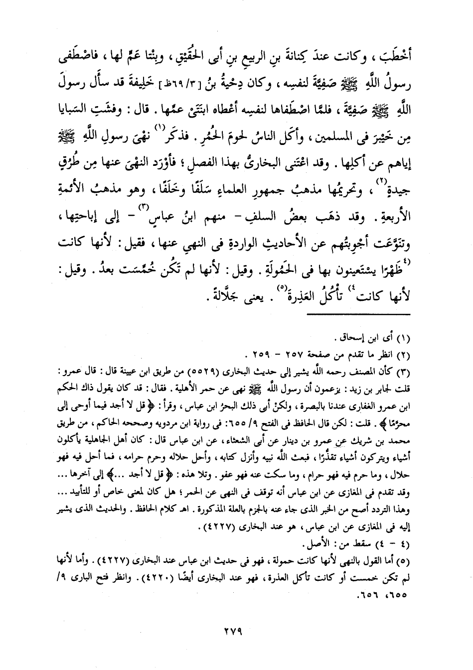 أَخْطَبَ، وَكَانَتْ عِنْدَ كِنَانَةَ بْنِ الرَّبِيعِ بْنِ أَبِي الْحُقَيْقِ، وَبِنْتَا عَمٍّ لَهَا، فَاصْطَفَى رَسُولُ اللَّهِ صَلَّى اللَّهُ عَلَيْهِ وَسَلَّمَ صَفِيَّةَ لِنَفْسِهِ، وَكَانَ دِحْيَةُ بْنُ خَلِيفَةَ قَدْ سَأَلَ رَسُولَ اللَّهِ صَلَّى اللَّهُ عَلَيْهِ وَسَلَّمَ صَفِيَّةَ، فَلَمَّا اصْطَفَاهَا لِنَفْسِهِ أَعْطَاهُ ابْنَتَيْ عَمِّهَا، قَالَ: وَفَشَتِ السَّبَايَا مِنْ خَيْبَرَ فِي الْمُسْلِمِينَ، وَأَكَلَ النَّاسُ لُحُومَ الْحُمُرِ. فَذَكَرَ نَهْيَ رَسُولِ اللَّهِ صَلَّى اللَّهُ عَلَيْهِ وَسَلَّمَ إِيَّاهُمْ عَنْ أَكْلِهَا. وَقَدِ اعْتَنَى الْبُخَارِيُّ بِهَذَا الْفَصْلِ؛ فَأَوْرَدَ النَّهْيَ عَنْهَا مِنْ طُرُقٍ جَيِّدَةٍ، وَتَحْرِيمُهَا مَذْهَبُ جُمْهُورِ الْعُلَمَاءِ سَلَفًا وَخَلَفًا، وَهُوَ مَذْهَبُ الْأَئِمَّةِ الْأَرْبَعَةِ. وَقَدْ ذَهَبَ بَعْضُ السَّلَفِ - مِنْهُمُ ابْنُ عَبَّاسٍ - إِلَى إِبَاحَتِهَا وَتَنَوَّعَتْ أَجْوِبَتُهُمْ عَنِ الْأَحَادِيثِ الْوَارِدَةِ فِي النَّهْيِ عَنْهَا، فَقِيلَ: لِأَنَّهَا كَانَتْ ظَهْرًا يَسْتَعِينُونَ بِهَا فِي الْحَمُولَةِ، وَقِيلَ: لِأَنَّهَا لَمْ تَكُنْ خُمِّسَتْ بَعْدُ. وَقِيلَ: لِأَنَّهَا كَانَتْ تَأْكُلُ الْعَذِرَةَ. يَعْنِي جَلَّالَةً.