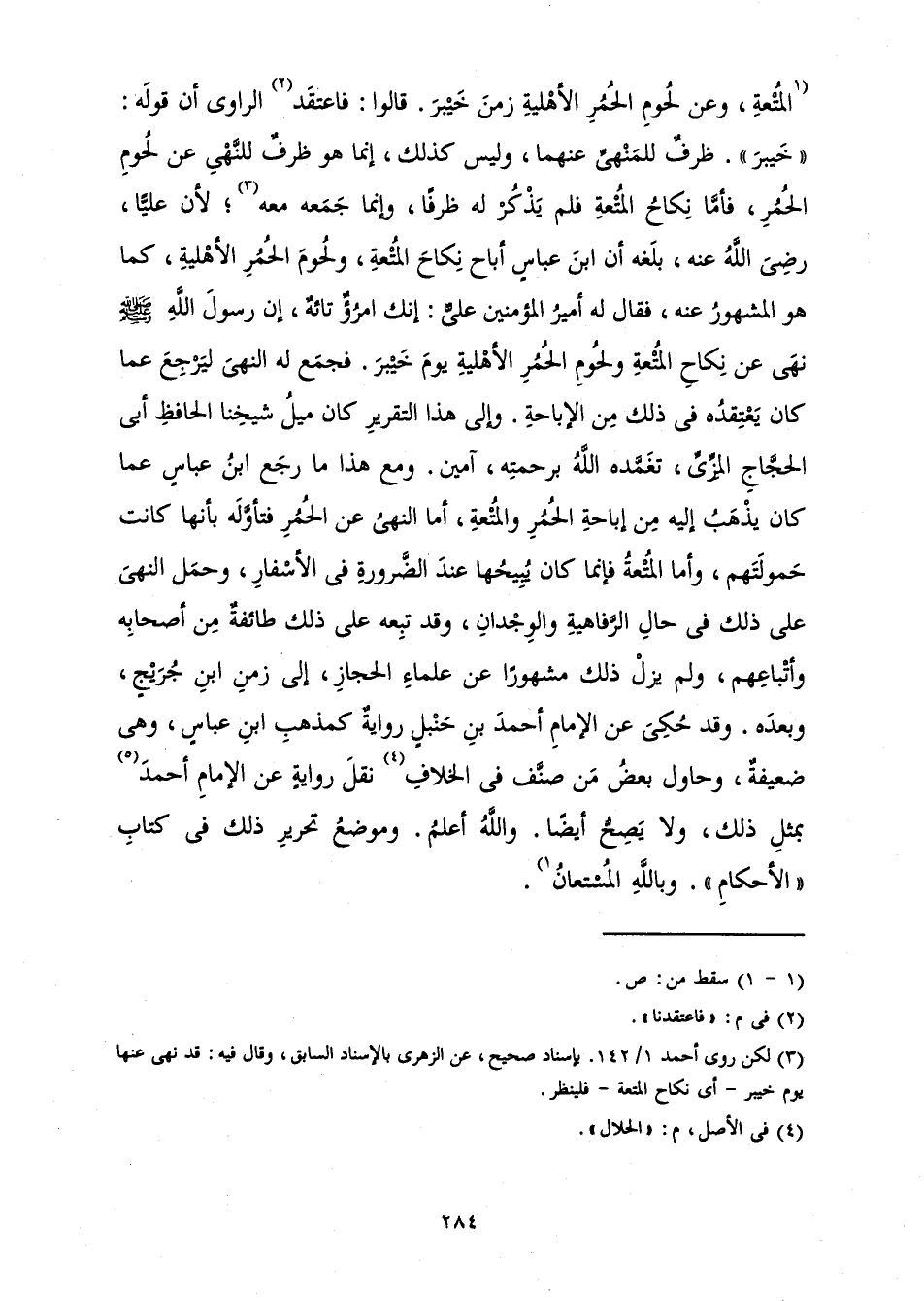 الْمُتْعَةِ، وَعَنْ لُحُومِ الْحُمُرِ الْأَهْلِيَّةِ زَمَنَ خَيْبَرَ» قَالُوا: فَاعْتَقَدَ الرَّاوِي أَنَّ قَوْلَهُ: " خَيْبَرَ " ظَرْفٌ لِلْمَنْهِيِّ عَنْهُمَا، وَلَيْسَ كَذَلِكَ، إِنَّمَا هُوَ ظَرْفٌ لِلنَّهْيِ عَنْ لُحُومِ الْحُمُرِ، فَأَمَّا نِكَاحُ الْمُتْعَةِ فَلَمْ يَذْكُرْ لَهُ ظَرْفًا، وَإِنَّمَا جَمَعَهُ مَعَهُ؛ لِأَنَّ عَلِيًّا، رَضِيَ اللَّهُ عَنْهُ، بَلَغَهُ أَنَّ ابْنَ عَبَّاسٍ أَبَاحَ نِكَاحَ الْمُتْعَةِ، وَلُحُومَ الْحُمُرِ الْأَهْلِيَّةِ، كَمَا هُوَ الْمَشْهُورُ عَنْهُ، فَقَالَ لَهُ أَمِيرُ الْمُؤْمِنِينَ عَلِيٌّ: إِنَّكَ امْرُؤٌ تَائِهٌ، إِنَّ رَسُولَ اللَّهِ صَلَّى اللَّهُ عَلَيْهِ وَسَلَّمَ نَهَى عَنْ نِكَاحِ الْمُتْعَةِ وَلُحُومِ الْحُمُرِ الْأَهْلِيَّةِ يَوْمَ خَيْبَرَ. فَجَمَعَ لَهُ النَّهْيَ لِيَرْجِعَ عَمَّا كَانَ يَعْتَقِدُهُ فِي ذَلِكَ مِنَ الْإِبَاحَةِ. وَإِلَى هَذَا التَّقْرِيرِ كَانَ مَيْلُ شَيْخِنَا الْحَافِظِ أَبِي الْحَجَّاجِ الْمِزِّيِّ، تَغَمَّدَهُ اللَّهُ بِرَحْمَتِهِ، آمِينَ. وَمَعَ هَذَا مَا رَجَعَ ابْنُ عَبَّاسٍ عَمَّا كَانَ يَذْهَبُ إِلَيْهِ مِنْ إِبَاحَةِ الْحُمُرِ وَالْمُتْعَةِ، أَمَّا النَّهْيُ عَنِ الْحُمُرِ فَتَأَوَّلَهُ بِأَنَّهَا كَانَتْ حَمُولَتَهُمْ، وَأَمَّا الْمُتْعَةُ فَإِنَّمَا كَانَ يُبِيحُهَا عِنْدَ الضَّرُورَةِ فِي الْأَسْفَارِ، وَحَمَلَ النَّهْيَ عَلَى ذَلِكَ فِي حَالِ الرَّفَاهِيَةِ وَالْوِجْدَانِ، وَقَدْ تَبِعَهُ عَلَى ذَلِكَ طَائِفَةٌ مِنْ أَصْحَابِهِ وَأَتْبَاعِهِمْ، وَلَمْ يَزَلْ ذَلِكَ مَشْهُورًا عَنْ عُلَمَاءِ الْحِجَازِ، إِلَى زَمَنِ ابْنِ جُرَيْجٍ، وَبَعْدَهُ. وَقَدْ حُكِيَ عَنِ الْإِمَامِ أَحْمَدَ بْنِ حَنْبَلٍ رِوَايَةٌ كَمَذْهَبِ ابْنِ عَبَّاسٍ، وَهِيَ ضَعِيفَةٌ، وَحَاوَلَ بَعْضُ مَنْ صَنَّفَ فِي الْخِلَافِ نَقْلَ رِوَايَةٍ عَنِ الْإِمَامِ أَحْمَدَ بِمِثْلِ ذَلِكَ، وَلَا يَصِحُّ أَيْضًا. وَاللَّهُ أَعْلَمُ. وَمَوْضِعُ تَحْرِيرِ ذَلِكَ فِي كِتَابِ " الْأَحْكَامِ " وَبِاللَّهِ الْمُسْتَعَانُ.