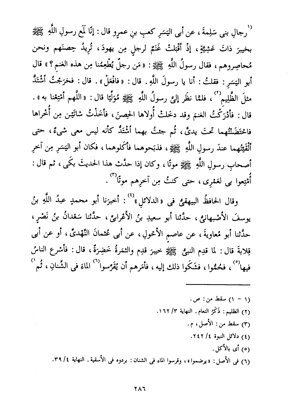 رِجَالِ بَنِي سَلِمَةَ، عَنْ أَبِي الْيَسَرِ كَعْبِ بْنِ عَمْرٍو قَالَ: «إِنَّا لَمَعَ رَسُولِ اللَّهِ صَلَّى اللَّهُ عَلَيْهِ وَسَلَّمَ بِخَيْبَرَ ذَاتَ عَشِيَّةٍ، إِذْ أَقْبَلَتْ غَنَمٌ لِرَجُلٍ مِنْ يَهُودَ، تُرِيدُ حِصْنَهُمْ وَنَحْنُ مُحَاصِرُوهُمْ، فَقَالَ رَسُولُ اللَّهِ صَلَّى اللَّهُ عَلَيْهِ وَسَلَّمَ: " مَنْ رَجُلٌ يُطْعِمُنَا مِنْ هَذِهِ الْغَنَمِ؟ ". قَالَ أَبُو الْيَسَرِ: فَقُلْتُ: أَنَا يَا رَسُولَ اللَّهِ. قَالَ: " فَافْعَلْ ". قَالَ: فَخَرَجْتُ أَشْتَدُّ مِثْلَ الظَّلِيمِ، فَلَمَّا نَظَرَ إِلَيَّ رَسُولُ اللَّهِ صَلَّى اللَّهُ عَلَيْهِ وَسَلَّمَ مُوَلِّيًا قَالَ: " اللَّهُمَّ أَمْتِعْنَا بِهِ ". قَالَ: فَأَدْرَكْتُ الْغَنَمَ وَقَدْ دَخَلَتْ أَوَّلُهَا الْحِصْنَ، فَأَخَذْتُ شَاتَيْنِ مِنْ أُخْرَاهَا فَاحْتَضَنْتُهُمَا تَحْتَ يَدِي، ثُمَّ جِئْتُ بِهِمَا أَشْتَدُّ كَأَنَّهُ لَيْسَ مَعِي شَيْءٌ، حَتَّى أَلْقَيْتُهُمَا عِنْدَ رَسُولِ اللَّهِ صَلَّى اللَّهُ عَلَيْهِ وَسَلَّمَ فَذَبَحُوهُمَا فَأَكَلُوهُمَا، فَكَانَ أَبُو الْيَسَرِ مِنْ آخِرِ أَصْحَابِ رَسُولِ اللَّهِ صَلَّى اللَّهُ عَلَيْهِ وَسَلَّمَ مَوْتًا، وَكَانَ إِذَا حَدَّثَ هَذَا الْحَدِيثَ بَكَى، ثُمَّ قَالَ: أُمْتِعُوا بِي لَعَمْرِي، حَتَّى كُنْتُ مِنْ آخِرِهِمْ مَوْتًا» .