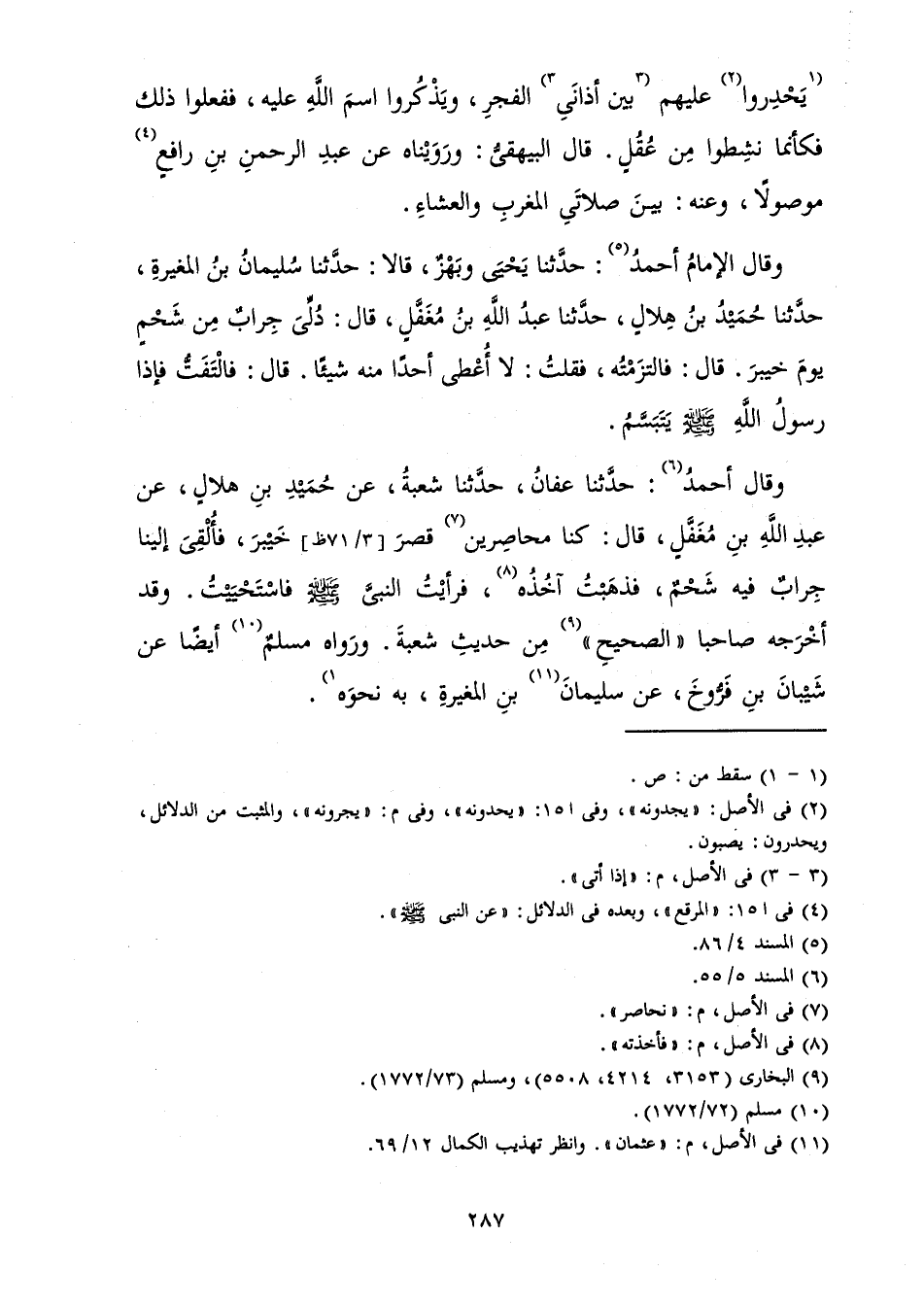 وَقَالَ أَحْمَدُ: حَدَّثَنَا عَفَّانُ، حَدَّثَنَا شُعْبَةُ، عَنْ حُمَيْدِ بْنِ هِلَالٍ، عَنْ عَبْدِ اللَّهِ بْنِ مُغَفَّلٍ، قَالَ: كُنَّا مُحَاصِرِينَ قَصْرَ خَيْبَرَ، فَأُلْقِيَ إِلَيْنَا جِرَابٌ فِيهِ شَحْمٌ، فَذَهَبْتُ آخُذُهُ، فَرَأَيْتُ النَّبِيَّ صَلَّى اللَّهُ عَلَيْهِ وَسَلَّمَ فَاسْتَحْيَيْتُ. وَقَدْ أَخْرَجَهُ صَاحِبَا " الصَّحِيحِ " مِنْ حَدِيثِ شُعْبَةَ. وَرَوَاهُ مُسْلِمٌ أَيْضًا عَنْ شَيْبَانَ بْنِ فَرُّوخَ، عَنْ سُلَيْمَانَ بْنِ الْمُغِيرَةِ بِهِ نَحْوَهُ.
