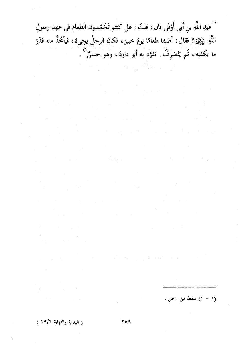 عَبْدِ اللَّهِ بْنِ أَبِي أَوْفَى قَالَ: قُلْتُ: هَلْ كُنْتُمْ تُخَمِّسُونَ الطَّعَامَ فِي عَهْدِ رَسُولِ اللَّهِ صَلَّى اللَّهُ عَلَيْهِ وَسَلَّمَ؟ فَقَالَ: أَصَبْنَا طَعَامًا يَوْمَ خَيْبَرَ، فَكَانَ الرَّجُلُ يَجِيءُ، فَيَأْخُذُ مِنْهُ قَدْرَ مَا يَكْفِيهِ، ثُمَّ يَنْصَرِفُ. تَفَرَّدَ بِهِ أَبُو دَاوُدَ، وَهُوَ حَسَنٌ.