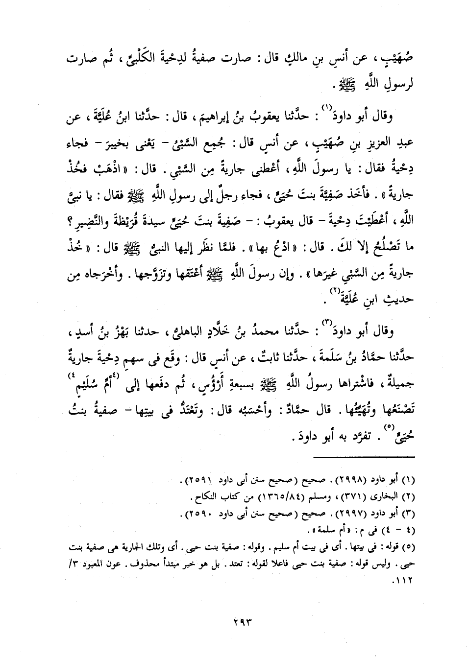 وَقَالَ أَبُو دَاوُدَ: حَدَّثَنَا يَعْقُوبُ بْنُ إِبْرَاهِيمَ، قَالَ: حَدَّثَنَا ابْنُ عُلَيَّةَ، عَنْ عَبْدِ الْعَزِيزِ بْنِ صُهَيْبٍ، عَنْ أَنَسٍ قَالَ: «جُمِعَ السَّبْيُ - يَعْنِي بِخَيْبَرَ - فَجَاءَ دِحْيَةُ فَقَالَ: يَا رَسُولَ اللَّهِ، أَعْطِنِي جَارِيَةً مِنَ السَّبْيِ. قَالَ: " اذْهَبْ فَخُذْ جَارِيَةً ". فَأَخَذَ صَفِيَّةَ بِنْتَ حُيَيٍّ، فَجَاءَ رَجُلٌ إِلَى رَسُولِ اللَّهِ صَلَّى اللَّهُ عَلَيْهِ وَسَلَّمَ فَقَالَ: يَا نَبِيَّ اللَّهِ، أَعْطَيْتَ دِحْيَةَ - قَالَ يَعْقُوبُ: - صَفِيَّةَ بِنْتَ حُيَيٍّ سَيِّدَةَ قُرَيْظَةَ وَالنَّضِيرِ؟ مَا تَصْلُحُ إِلَّا لَكَ. قَالَ: " ادْعُ بِهَا ". فَلَمَّا نَظَرَ إِلَيْهَا النَّبِيُّ صَلَّى اللَّهُ عَلَيْهِ وَسَلَّمَ قَالَ: " خُذْ جَارِيَةً مِنَ السَّبْيِ غَيْرَهَا ". وَإِنَّ رَسُولَ اللَّهِ صَلَّى اللَّهُ عَلَيْهِ وَسَلَّمَ أَعْتَقَهَا وَتَزَوَّجَهَا» ، وَأَخْرَجَاهُ مِنْ حَدِيثِ ابْنِ عُلَيَّةَ