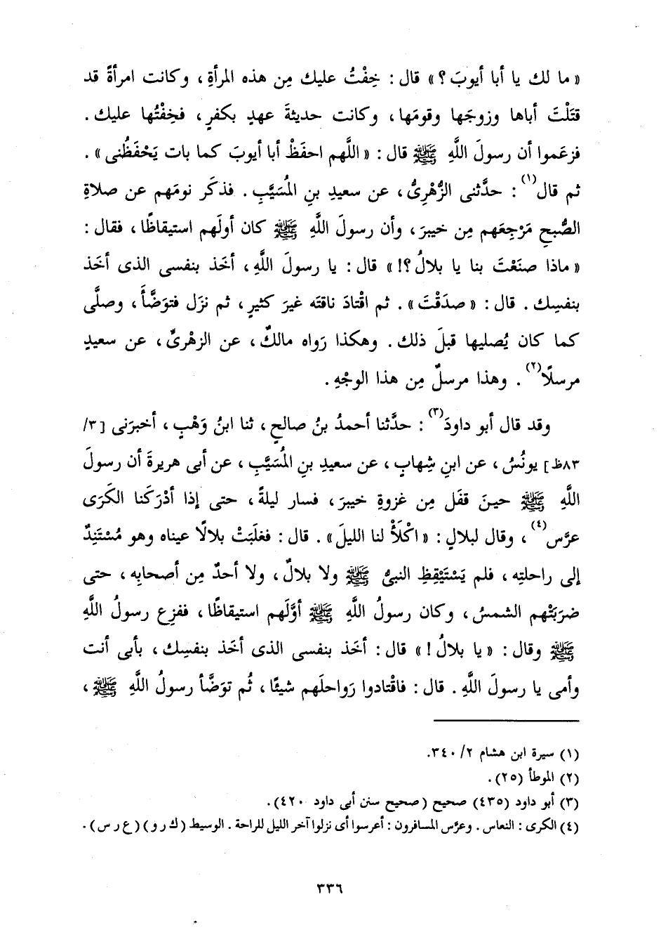 " مَا لَكَ يَا أَبَا أَيُّوبَ؟ " قَالَ: خِفْتُ عَلَيْكَ مِنْ هَذِهِ الْمَرْأَةِ، وَكَانَتِ امْرَأَةً قَدْ قَتَلْتَ أَبَاهَا وَزَوْجَهَا وَقَوْمَهَا، وَكَانَتْ حَدِيثَةَ عَهْدٍ بِكُفْرٍ، فَخِفْتُهَا عَلَيْكَ. فَزَعَمُوا أَنَّ رَسُولَ اللَّهِ صَلَّى اللَّهُ عَلَيْهِ وَسَلَّمَ قَالَ: " «اللَّهُمَّ احْفَظْ أَبَا أَيُّوبَ كَمَا بَاتَ يَحْفَظُنِي» ". ثُمَّ قَالَ: حَدَّثَنِي الزُّهْرِيُّ، عَنْ سَعِيدِ بْنِ الْمُسَيَّبِ فَذَكَرَ نَوْمَهُمْ عَنْ صَلَاةِ الصُّبْحِ مَرْجِعَهُمْ مِنْ خَيْبَرَ، وَأَنَّ رَسُولَ اللَّهِ صَلَّى اللَّهُ عَلَيْهِ وَسَلَّمَ كَانَ أَوَّلَهُمُ اسْتِيقَاظًا، فَقَالَ: " مَاذَا صَنَعْتَ بِنَا يَا بِلَالُ؟ " قَالَ: يَا رَسُولَ اللَّهِ، أَخَذَ بِنَفْسِي الَّذِي أَخَذَ بِنَفْسِكَ. قَالَ: " صَدَقْتَ ". ثُمَّ اقْتَادَ نَاقَتَهُ غَيْرَ كَثِيرٍ، ثُمَّ نَزَلَ فَتَوَضَّأَ، وَصَلَّى كَمَا كَانَ يُصَلِّيهَا قَبْلَ ذَلِكَ. وَهَكَذَا رَوَاهُ مَالِكٌ، عَنِ الزُّهْرِيِّ، عَنْ سَعِيدٍ مُرْسَلًا. وَهَذَا مُرْسَلٌ مِنْ هَذَا الْوَجْهِ.