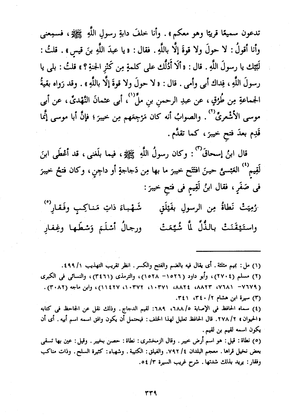 تَدْعُونَ سَمِيعًا قَرِيبًا وَهُوَ مَعَكُمْ ". وَأَنَا خَلْفَ دَابَّةِ رَسُولِ اللَّهِ صَلَّى اللَّهُ عَلَيْهِ وَسَلَّمَ، فَسَمِعَنِي وَأَنَا أَقُولُ: لَا حَوْلَ وَلَا قُوَّةَ إِلَّا بِاللَّهِ. فَقَالَ: " يَا عَبْدَ اللَّهِ بْنَ قَيْسٍ ". قُلْتُ: لَبَّيْكَ يَا رَسُولَ اللَّهِ. قَالَ: " أَلَا أَدُلُّكَ عَلَى كَلِمَةٍ مِنْ كَنْزِ الْجَنَّةِ؟ ". قُلْتُ: بَلَى يَا رَسُولَ اللَّهِ، فِدَاكَ أَبِي وَأُمِّي. قَالَ: " لَا حَوْلَ وَلَا قُوَّةَ إِلَّا بِاللَّهِ» وَقَدْ رَوَاهُ بَقِيَّةُ الْجَمَاعَةِ مِنْ طُرُقٍ، عَنْ عَبْدِ الرَّحْمَنِ بْنِ مَلٍّ أَبِي عُثْمَانَ النَّهْدَيِّ، عَنْ أَبِي مُوسَى الْأَشْعَرِيِّ. وَالصَّوَابُ أَنَّهُ كَانَ مَرْجِعَهُمْ مِنْ خَيْبَرَ، فَإِنَّ أَبَا مُوسَى إِنَّمَا قَدِمَ بَعْدَ فَتْحِ خَيْبَرَ، كَمَا تَقَدَّمَ.