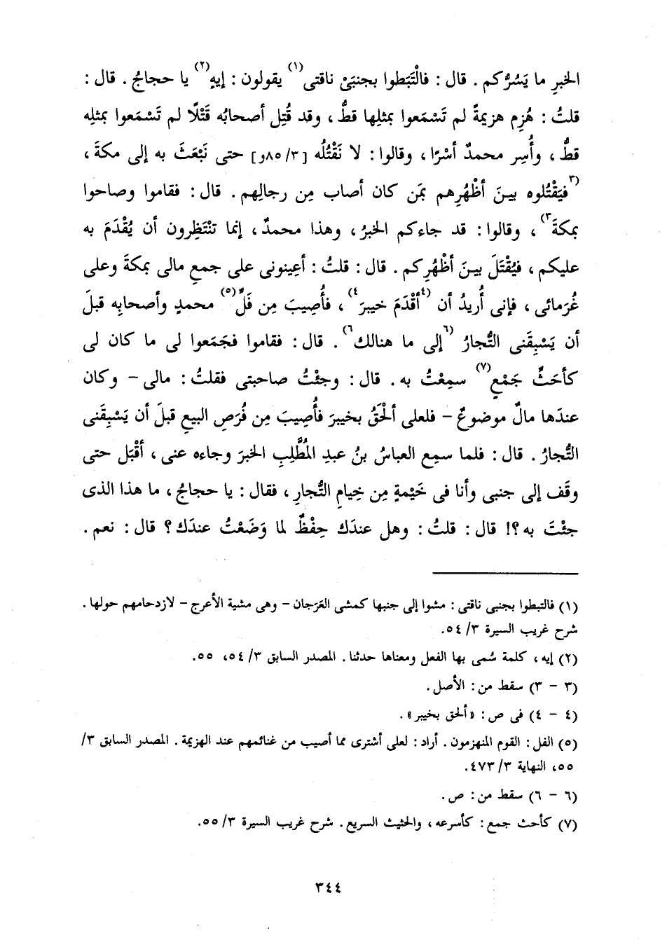 الْخَبَرِ مَا يَسُرُّكُمْ. قَالَ: فَالْتَبَطُوا بِجَنْبَيْ نَاقَتِي يَقُولُونَ: إِيهٍ يَا حَجَّاجُ. قَالَ: قُلْتُ: هُزِمَ هَزِيمَةً لَمْ تَسْمَعُوا بِمِثْلِهَا قَطُّ، وَقَدْ قُتِلَ أَصْحَابُهُ قَتْلًا لَمْ تَسْمَعُوا بِمِثْلِهِ قَطُّ، وَأُسِرَ مُحَمَّدٌ أَسْرًا، وَقَالُوا: لَا نَقْتُلُهُ حَتَّى نَبْعَثَ بِهِ إِلَى مَكَّةَ، فَيَقْتُلُوهُ بَيْنَ أَظْهُرِهِمْ بِمَنْ كَانَ أَصَابَ مِنْ رِجَالِهِمْ. قَالَ: فَقَامُوا وَصَاحُوا بِمَكَّةَ، وَقَالُوا: قَدْ جَاءَكُمُ الْخَبَرُ، وَهَذَا مُحَمَّدٌ، إِنَّمَا تَنْتَظِرُونَ أَنْ يُقْدَمَ بِهِ عَلَيْكُمْ، فَيُقْتَلَ بَيْنَ أَظْهُرِكُمْ، قَالَ: قُلْتُ: أَعِينُونِي عَلَى جَمْعِ مَالِي بِمَكَّةَ وَعَلَى غُرَمَائِي، فَإِنِّي أُرِيدُ أَنْ أَقْدِمَ خَيْبَرَ، فَأُصِيبَ مِنْ فَلِّ مُحَمَّدٍ وَأَصْحَابِهِ قَبْلَ أَنْ يَسْبِقَنِي التُّجَّارُ إِلَى مَا هُنَالِكَ. قَالَ: فَقَامُوا فَجَمَعُوا لِي مَا كَانَ لِي كَأَحَثِّ جَمْعٍ سَمِعْتُ بِهِ. قَالَ: وَجِئْتُ صَاحِبَتِي فَقُلْتُ: مَالِي - وَكَانَ عِنْدَهَا مَالٌ مَوْضُوعٌ - فَلَعَلِّي أَلْحَقُ بِخَيْبَرَ فَأُصِيبَ مِنْ فُرَصِ الْبَيْعِ قَبْلَ أَنْ يَسْبِقَنِي التُّجَّارُ. قَالَ: فَلَمَّا سَمِعَ الْعَبَّاسُ بْنُ عَبْدِ الْمُطَّلِبِ الْخَبَرَ وَجَاءَهُ عَنِّي، أَقْبَلَ حَتَّى وَقَفَ إِلَى جَنْبِي وَأَنَا فِي خَيْمَةٍ مِنْ خِيَامِ التُّجَّارِ، فَقَالَ: يَا حَجَّاجُ، مَا هَذَا الَّذِي جِئْتَ بِهِ؟! قَالَ: قُلْتُ: وَهَلْ عِنْدَكَ حِفْظٌ لِمَا وَضَعْتُ عِنْدَكَ؟ قَالَ: نَعَمْ.