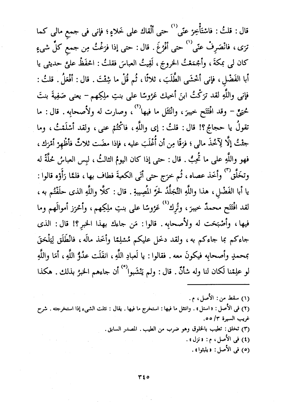 قَالَ: قُلْتُ: فَاسْتَأْخِرْ عَنِّي حَتَّى أَلْقَاكَ عَلَى خَلَاءٍ، فَإِنِّي فِي جَمْعِ مَالِي كَمَا تَرَى، فَانْصَرَفَ عَنِّي حَتَّى أَفْرُغَ. قَالَ: حَتَّى إِذَا فَرَغْتُ مِنْ جَمْعِ كَلِّ شَيْءٍ كَانَ لِي بِمَكَّةَ، وَأَجْمَعْتُ الْخُرُوجَ، لَقِيتُ الْعَبَّاسَ فَقُلْتُ: احْفَظْ عَلَيَّ حَدِيثِي يَا أَبَا الْفَضْلِ، فَإِنِّي أَخْشَى الطَّلَبَ، ثَلَاثًا، ثُمَّ قُلْ مَا شِئْتَ. قَالَ: أَفْعَلُ. قُلْتُ: فَإِنِّي وَاللَّهِ لَقَدْ تَرَكْتُ ابْنَ أَخِيكَ عَرُوسًا عَلَى بِنْتِ مَلِكِهِمْ - يَعْنِي صَفِيَّةَ بِنْتَ حُيَيٍّ - وَقَدِ افْتَتَحَ خَيْبَرَ، وَانْتَثَلَ مَا فِيهَا، وَصَارَتْ لَهُ وَلِأَصْحَابِهِ. قَالَ: مَا تَقُولُ يَا حَجَّاجُ؟ ! قَالَ: قُلْتُ: إِي وَاللَّهِ، فَاكْتُمْ عَنِّي، وَلَقَدْ أَسْلَمْتُ، وَمَا جِئْتُ إِلَّا لِآخُذَ مَالِيَ، فَرَقًا مِنْ أَنْ أُغْلَبَ عَلَيْهِ، فَإِذَا مَضَتْ ثَلَاثٌ فَأَظْهِرْ أَمْرَكَ، فَهُوَ وَاللَّهِ عَلَى مَا تُحِبُ قَالَ: حَتَّى إِذَا كَانَ الْيَوْمُ الثَّالِثُ، لَبِسَ الْعَبَّاسُ حُلَّةً لَهُ وَتَخَلَّقَ وَأَخْذَ عَصَاهُ، ثُمَّ خَرَجَ حَتَّى أَتَى الْكَعْبَةَ فَطَافَ بِهَا، فَلَمَّا رَأَوْهُ قَالُوا: يَا أَبَا الْفَضْلِ، هَذَا وَاللَّهِ التَّجَلُّدُ لِحَرِّ الْمُصِيبَةِ. قَالَ: كَلَّا وَاللَّهِ الَّذِي حَلَفْتُمْ بِهِ، لَقَدِ افْتَتَحَ مُحَمَّدٌ خَيْبَرَ، وَتُرِكَ عَرُوسًا عَلَى بِنْتِ مَلِكِهِمْ، وَأَحْرَزَ أَمْوَالَهُمْ وَمَا فِيهَا، وَأَصْبَحَتْ لَهُ وَلِأَصْحَابِهِ. قَالُوا: مَنْ جَاءَكَ بِهَذَا الْخَبَرِ؟! قَالَ: الَّذِي جَاءَكُمْ بِمَا جَاءَكُمْ بِهِ، وَلَقَدْ دَخَلَ عَلَيْكُمْ مُسْلِمًا وَأَخَذَ مَالَهُ، فَانْطَلَقَ لِيَلْحَقَ بِمُحَمَّدٍ وَأَصْحَابِهِ فَيَكُونُ مَعَهُ. فَقَالُوا: يَا لِعِبَادِ اللَّهِ، انْفَلَتَ عَدُوُّ اللَّهِ، أَمَا وَاللَّهِ لَوْ عَلِمْنَا لَكَانَ لَنَا وَلَهُ شَأْنٌ. قَالَ: وَلَمْ يَنْشَبُوا أَنْ جَاءَهُمُ الْخَبَرُ بِذَلِكَ. هَكَذَا