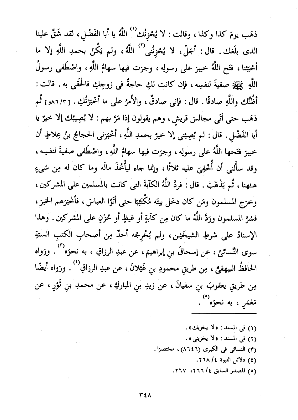 ذَهَبَ يَوْمَ كَذَا وَكَذَا، وَقَالَتْ: لَا يُحْزِنُكَ اللَّهُ يَا أَبَا الْفَضْلِ، لَقَدْ شَقَّ عَلَيْنَا الَّذِي بَلَغَكَ. قَالَ: أَجَلْ، لَا يُحْزِنُنِي اللَّهُ، وَلَمْ يَكُنْ بِحَمْدِ اللَّهِ إِلَّا مَا أَحْبَبْنَا، فَتَحَ اللَّهُ خَيْبَرَ عَلَى رَسُولِهِ، وَجَرَتْ فِيهَا سِهَامُ اللَّهِ، وَاصْطَفَى رَسُولُ اللَّهِ صَلَّى اللَّهُ عَلَيْهِ وَسَلَّمَ صَفِيَّةَ لِنَفْسِهِ، فَإِنْ كَانَتْ لَكِ حَاجَةٌ فِي زَوْجِكِ فَالْحَقِي بِهِ. قَالَتْ: أَظُنُّكَ وَاللَّهِ صَادِقًا قَالَ: فَإِنِّي صَادِقٌ، وَالْأَمْرُ عَلَى مَا أَخْبَرْتُكِ. ثُمَّ ذَهَبَ حَتَّى أَتَى مَجَالِسَ قُرَيْشٍ، وَهُمْ يَقُولُونَ إِذَا مَرَّ بِهِمْ: لَا يُصِيبُكَ إِلَّا خَيْرٌ يَا أَبَا الْفَضْلِ. قَالَ: لَمْ يُصِبْنِي إِلَّا خَيْرٌ بِحَمْدِ اللَّهِ، أَخْبَرَنِي الْحَجَّاجُ بْنُ عِلَاطٍ أَنَّ خَيْبَرَ فَتَحَهَا اللَّهُ عَلَى رَسُولِهِ، وَجَرَتْ فِيهَا سِهَامُ اللَّهِ، وَاصْطَفَى صَفِيَّةَ لِنَفْسِهِ، وَقَدْ سَأَلَنِي أَنْ أُخْفِيَ عَلَيْهِ ثَلَاثًا، وَإِنَّمَا جَاءَ لِيَأْخُذَ مَالَهُ وَمَا كَانَ لَهُ مِنْ شَيْءٍ هَاهُنَا، ثُمَّ يَذْهَبُ. قَالَ: فَرَدَّ اللَّهُ الْكَآبَةَ الَّتِي كَانَتْ بِالْمُسْلِمِينَ عَلَى الْمُشْرِكِينَ، وَخَرَجَ الْمُسْلِمُونَ وَمَنْ كَانَ دَخَلَ بَيْتَهُ مُكْتَئِبًا حَتَّى أَتَى الْعَبَّاسَ، فَأَخْبَرَهُمُ الْخَبَرَ، فَسُرَّ الْمُسْلِمُونَ وَرَدَّ مَا كَانَ مِنْ كَآبَةٍ أَوْ غَيْظٍ أَوْ حُزْنٍ عَلَى الْمُشْرِكِينَ. وَهَذَا الْإِسْنَادُ عَلَى شَرْطِ الشَّيْخَيْنِ، وَلَمْ يُخَرِّجْهُ أَحَدٌ مِنْ أَصْحَابِ الْكُتُبِ السِّتَّةِ سِوَى النَّسَائِيِّ، عَنْ إِسْحَاقَ بْنِ إِبْرَاهِيمَ، عَنْ عَبْدِ الرَّزَّاقِ، بِهِ نَحْوَهُ. وَرَوَاهُ الْحَافِظُ الْبَيْهَقِيُّ، مِنْ طَرِيقِ مَحْمُودِ بْنِ غَيْلَانَ، عَنْ عَبْدِ الرَّزَّاقِ. وَرَوَاهُ أَيْضًا مِنْ طَرِيقِ يَعْقُوبَ بْنِ سُفْيَانَ، عَنْ زَيْدِ بْنِ الْمُبَارَكِ، عَنْ مُحَمَّدِ بْنِ ثَوْرٍ، عَنْ