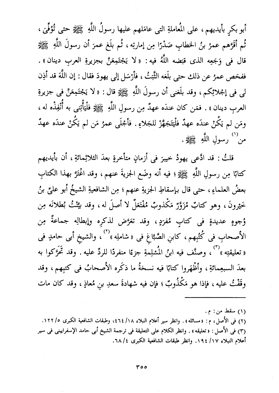 قُلْتُ: قَدِ ادَّعَى يَهُودُ خَيْبَرَ فِي أَزْمَانٍ مُتَأَخِّرَةٍ بَعْدَ الثَّلَاثِمِائَةِ، أَنَّ بِأَيْدِيهِمْ كِتَابًا مِنْ رَسُولِ اللَّهِ صَلَّى اللَّهُ عَلَيْهِ وَسَلَّمَ، فِيهِ أَنَّهُ وَضَعَ الْجِزْيَةَ عَنْهُمْ، وَقَدِ اغْتَرَّ بِهَذَا الْكِتَابِ بَعْضُ الْعُلَمَاءِ، حَتَّى قَالَ بِإِسْقَاطِ الْجِزْيَةِ عَنْهُمْ، مِنَ الشَّافِعِيَّةِ الشَّيْخُ أَبُو عَلِيٍّ خَيْرُونَ، وَهُوَ كِتَابٌ مُزَوَّرٌ مَكْذُوبٌ مُفْتَعَلٌ لَا أَصْلَ لَهُ، وَقَدْ بَيَّنْتُ بُطْلَانَهُ مِنْ وُجُوهٍ عَدِيدَةٍ فِي كِتَابٍ مُفْرَدٍ، وَقَدْ تَعَرَّضَ لِذِكْرِهِ وَإِبْطَالِهِ جَمَاعَةٌ مِنَ الْأَصْحَابِ فِي كُتُبِهِمْ، كَابْنِ الصَّبَّاغِ فِي " شَامِلِهِ "، وَالشَّيْخِ أَبِي حَامِدٍ فِي " تَعْلِيقَتِهِ " وَصَنَّفَ فِيهِ ابْنُ الْمُسْلِمَةِ جُزْءًا مُنْفَرِدًا لِلرَّدِّ عَلَيْهِ وَقَدْ تَحَرَّكُوا بِهِ بَعْدَ السَّبْعِمِائَةِ، وَأَظْهَرُوا كِتَابًا فِيهِ نُسْخَةُ مَا ذَكَرَهُ الْأَصْحَابُ فِي كُتُبِهِمْ، وَقَدْ وَقَفْتُ عَلَيْهِ، فَإِذَا هُوَ مَكْذُوبٌ، فَإِنَّ فِيهِ شَهَادَةَ سَعْدِ بْنِ مُعَاذٍ،، وَقَدْ كَانَ مَاتَ