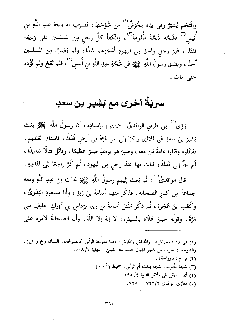 رَوَى مِنْ طَرِيقِ الْوَاقِدِيِّ بِإِسْنَادِهِ، أَنَّ رَسُولَ اللَّهِ صَلَّى اللَّهُ عَلَيْهِ وَسَلَّمَ بَعَثَ بَشِيرَ بْنَ سَعْدٍ فِي ثَلَاثِينَ رَاكِبًا إِلَى بَنِي مُرَّةَ فِي أَرْضِ فَدَكَ، فَاسْتَاقَ نَعَمَهُمْ، فَقَاتَلُوهُ وَقَتَلُوا عَامَّةَ مَنْ مَعَهُ، وَصَبَرَ هُوَ يَوْمَئِذٍ صَبْرًا عَظِيمًا، وَقَاتَلَ قِتَالًا شَدِيدًا، ثُمَّ لَجَأَ إِلَى فَدَكَ، فَبَاتَ بِهَا عِنْدَ رَجُلٍ مِنَ الْيَهُودِ، ثُمَّ كَرَّ رَاجِعًا إِلَى الْمَدِينَةِ.